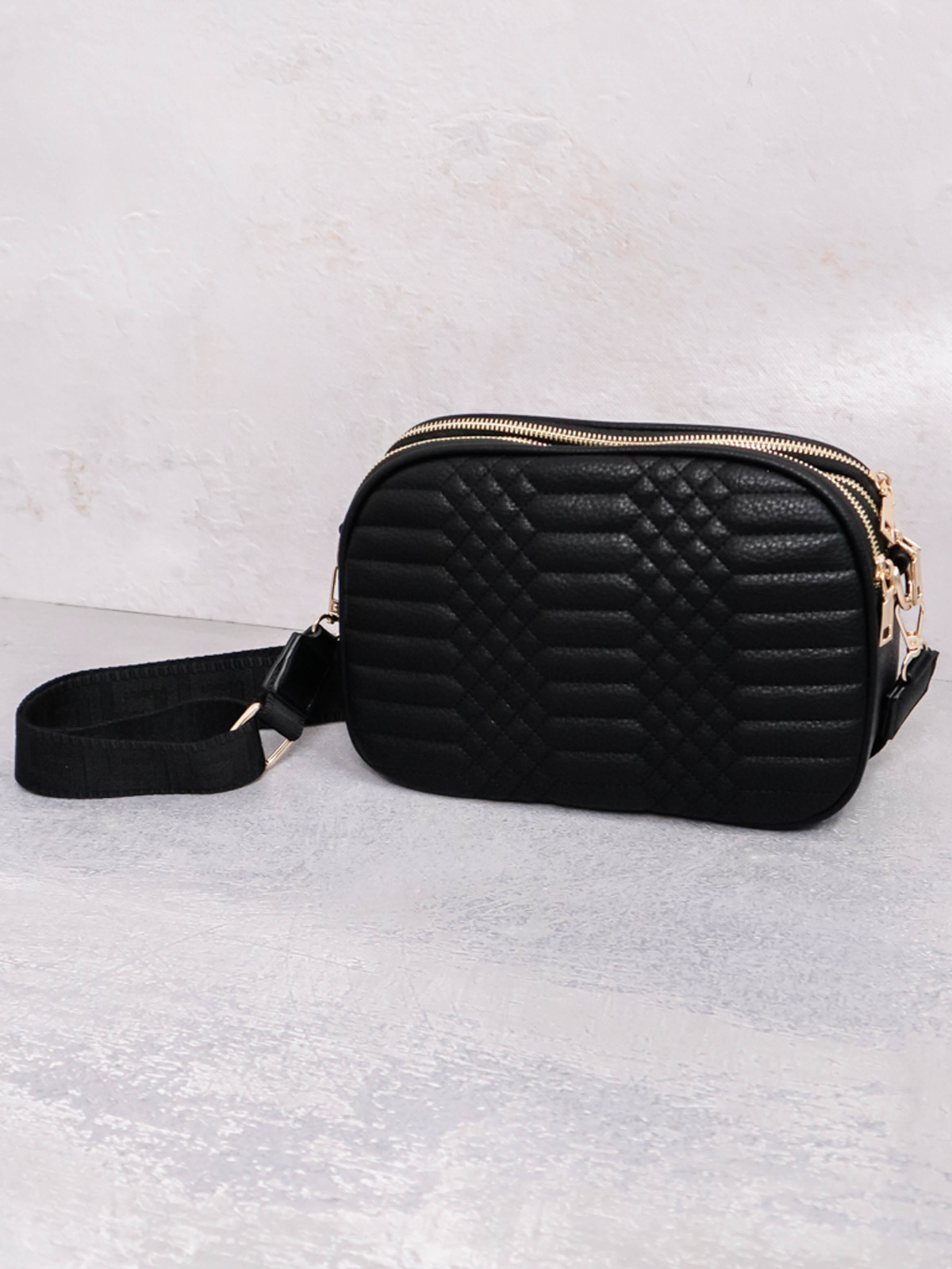 Torebka, kuferek z pikowanej ekoskóry. Posiada materiałowy, regulowany pasek. 3 komory, zapinane na zamek