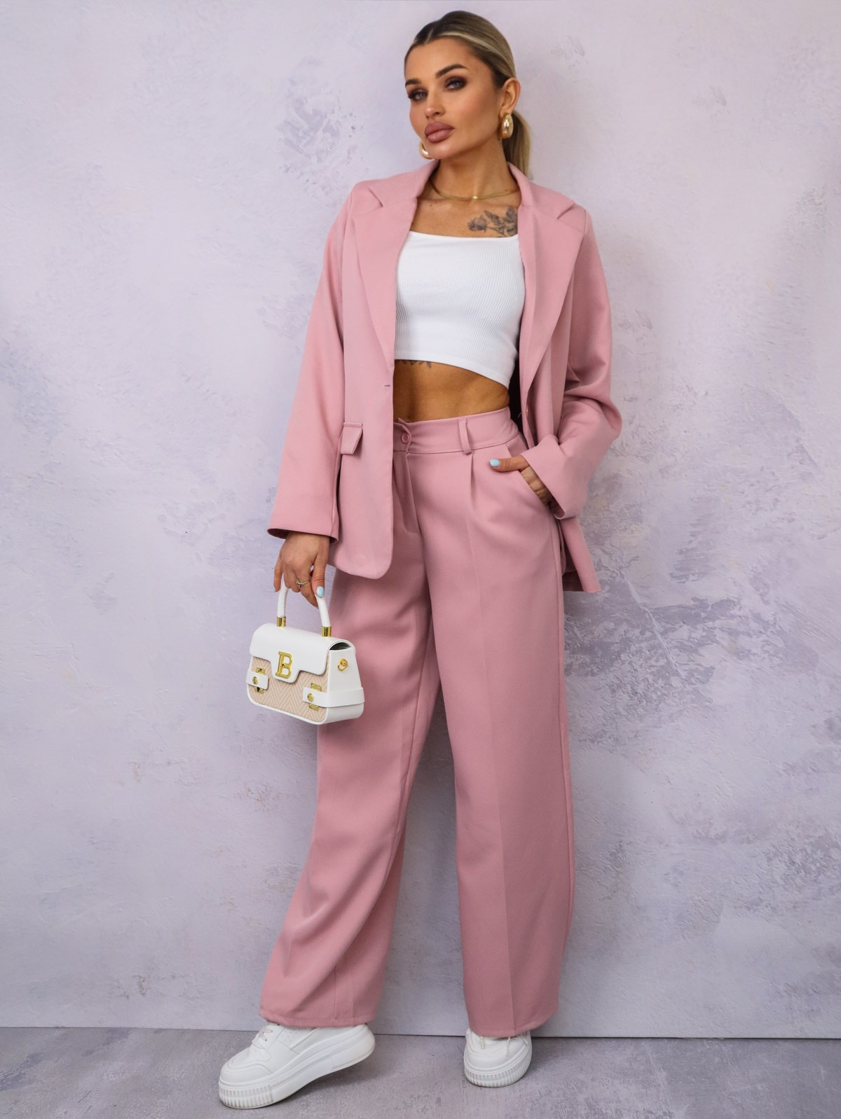 KOMPLET ELEGANCKI MARYNARKA+ SPODNIE- PUDROWORÓŻOWY