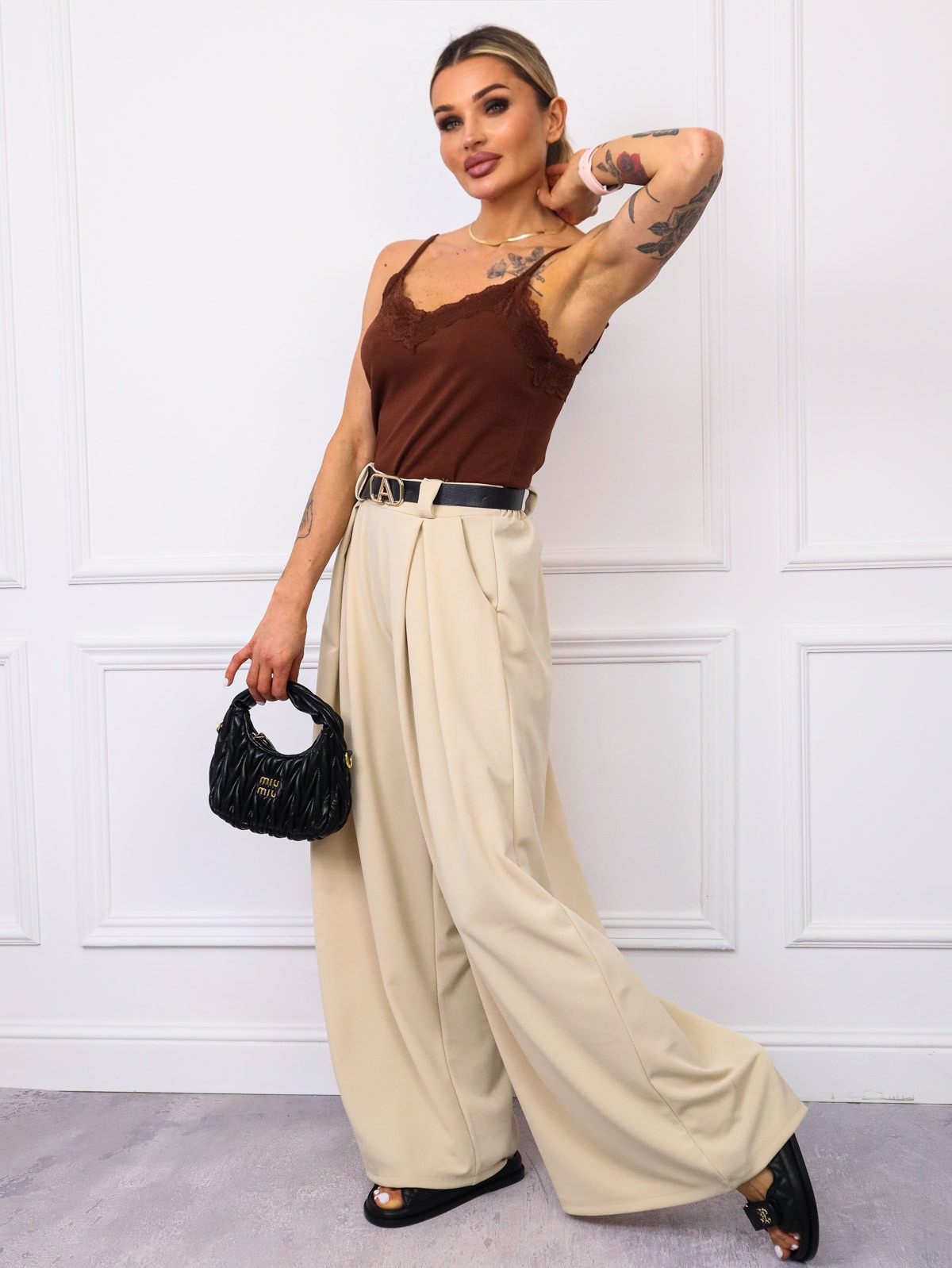SPODNIE MATERIAŁOWE Z SZEROKIMI NOGAWKAMI+ PASEK- JASNO BEŻOWE