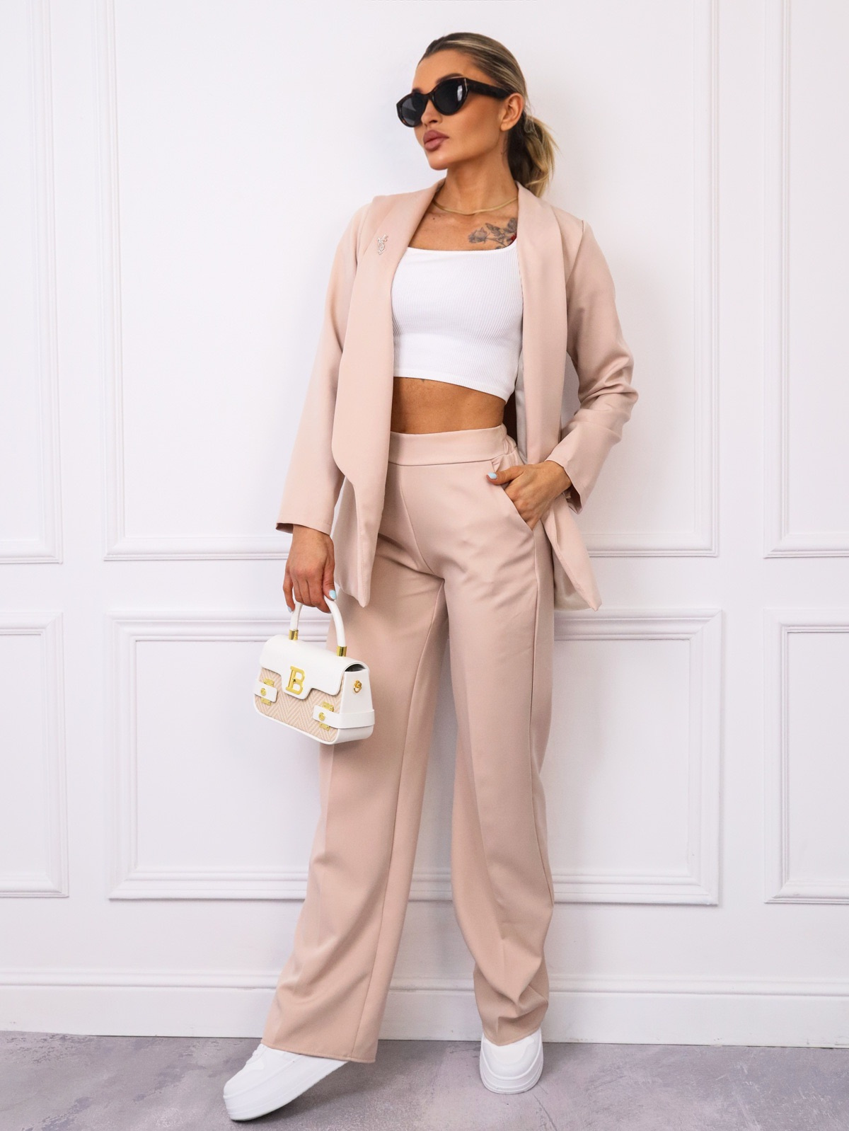 KOMPLET ELEGANCKI MARYNARKA+ SPODNIE- BROSZKA GRATIS- BEŻOWY