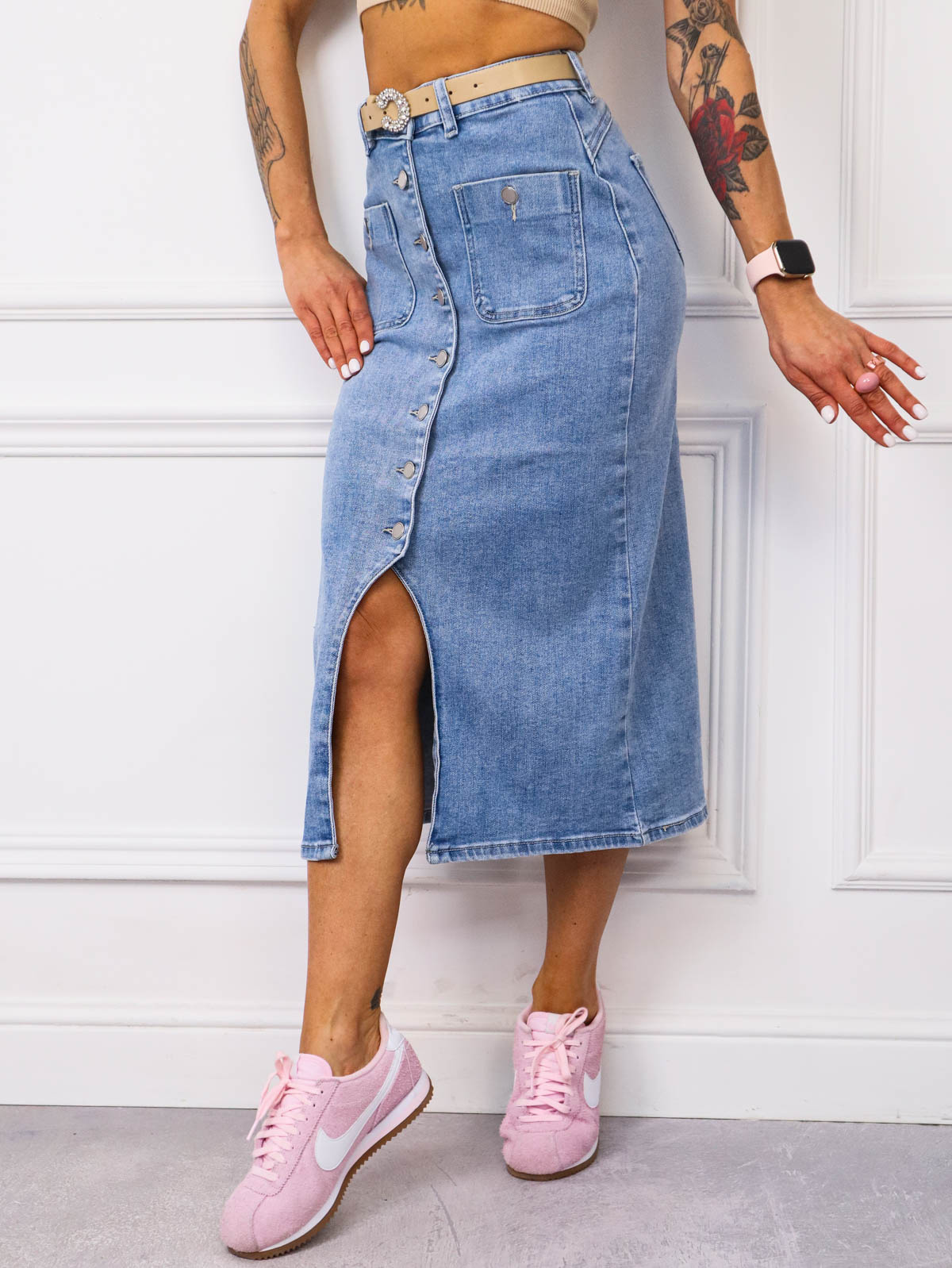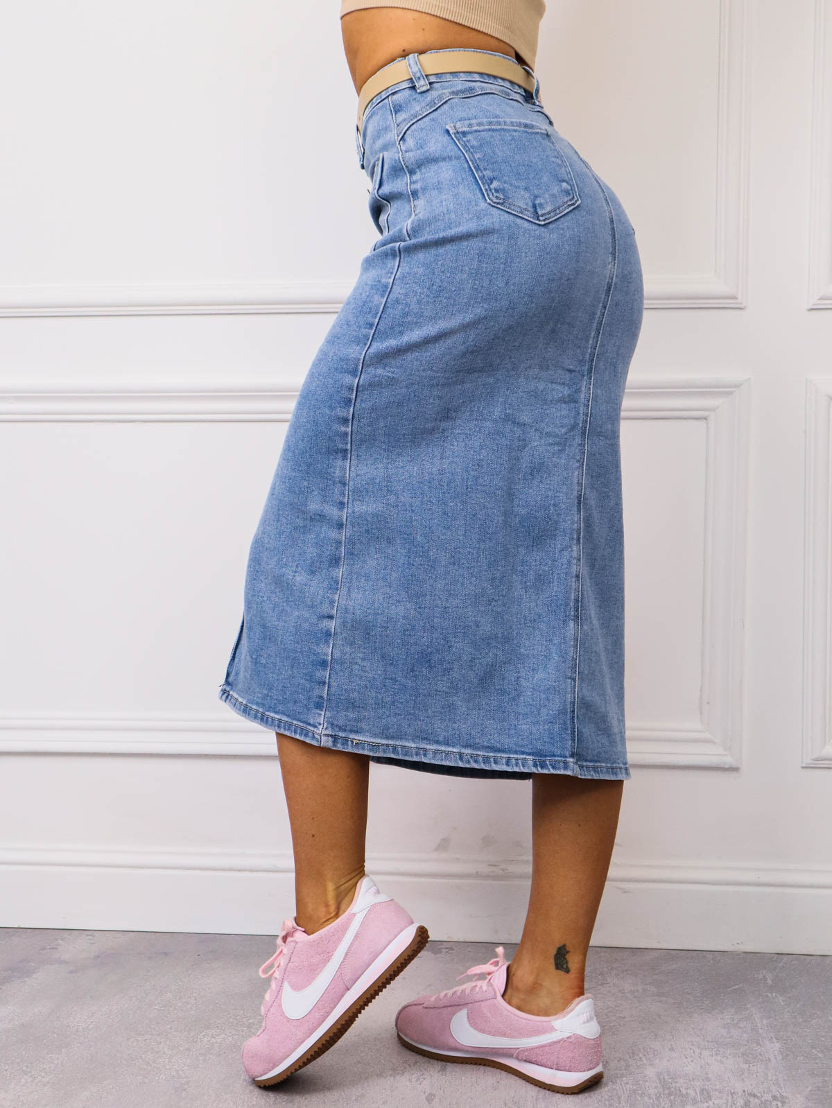 Jeansowa spódnica midi z guzikami z przodu i kieszeniami .Wysoki stan podkreśla talię,a uciągliwy jeans pięknie dopasowuje się do sylwetki Klasyka która pasuje do każdej stylizacji. Pasek gratis.