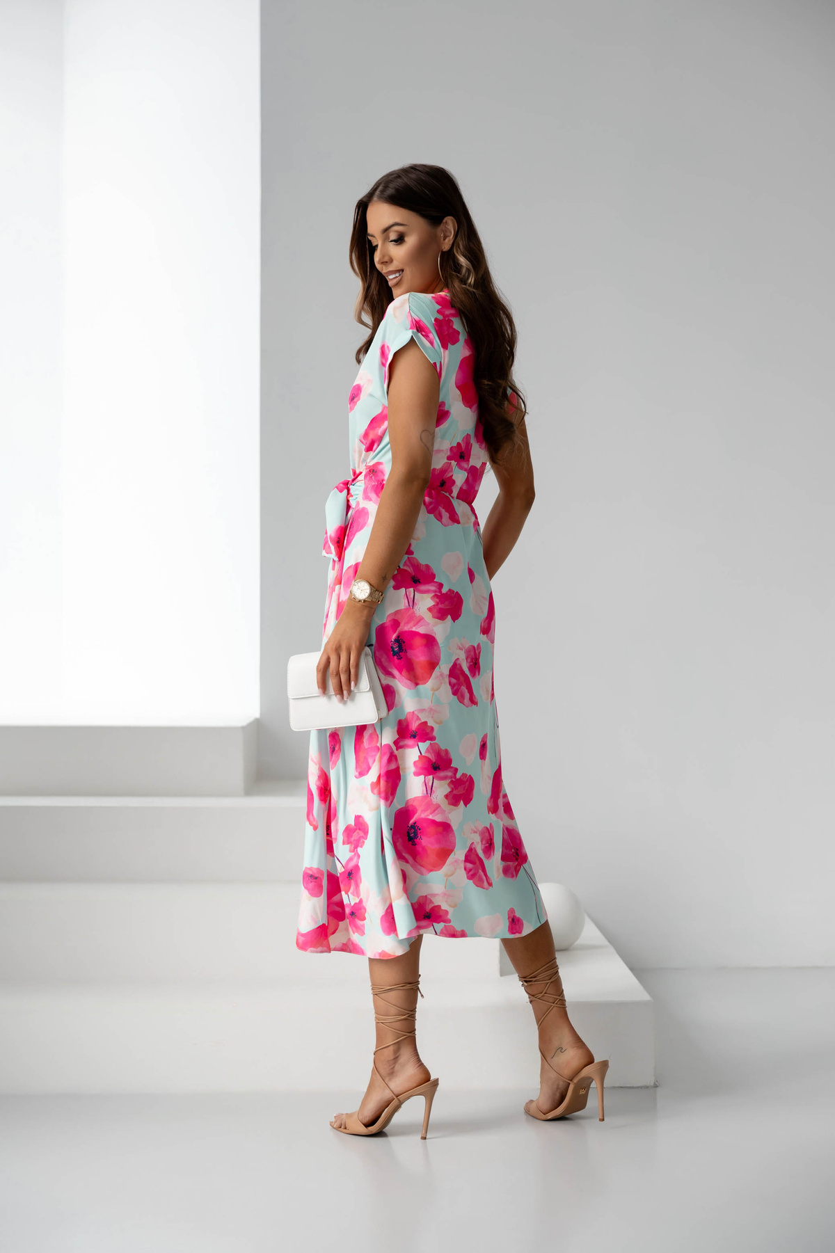SUKIENKA KOPERTOWA MIDI W KWIATY Z WIĄZANIEM- FUKSJA