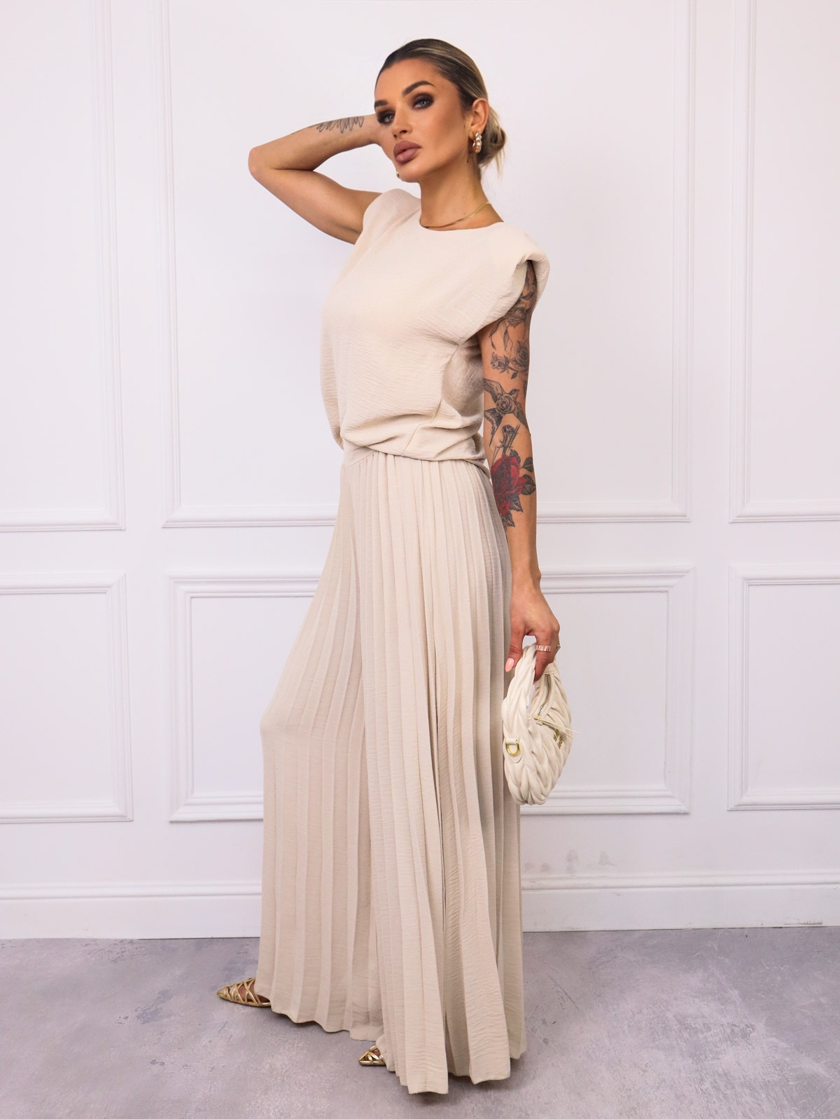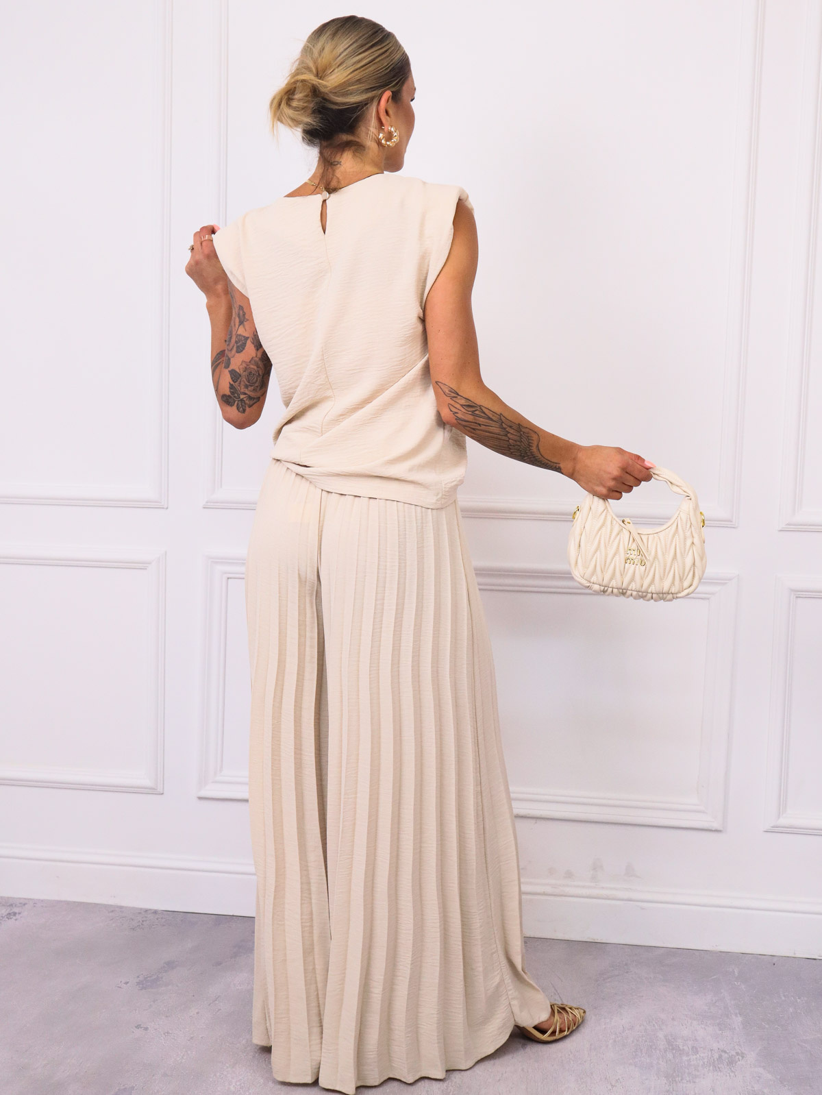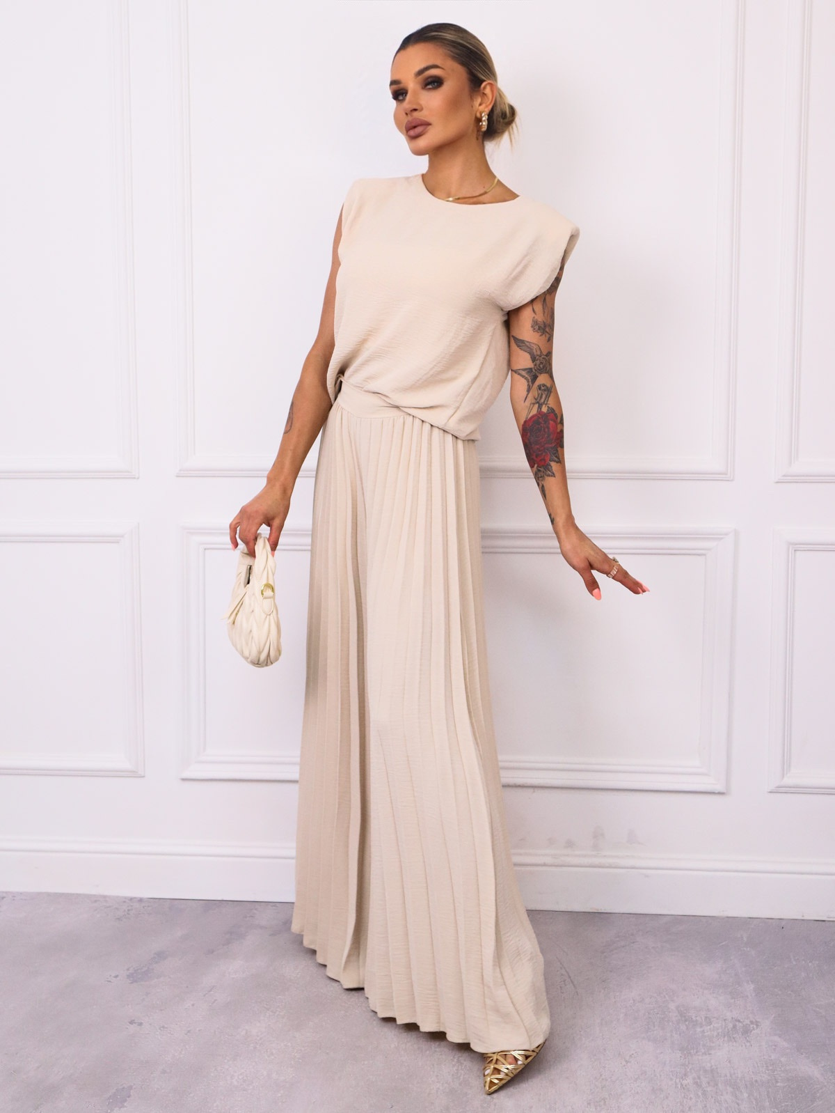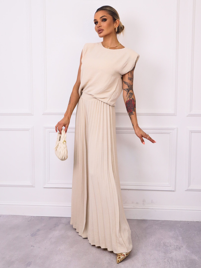KOMPLET BLUZKA+ SZEROKIE PLISOWANE SPODNIE- BEŻOWY