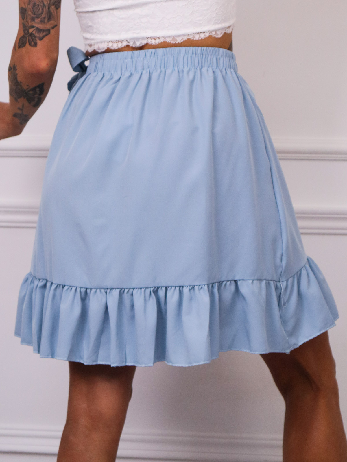 Spódnica z falbanami z gumą i wiązaniem w pasie.