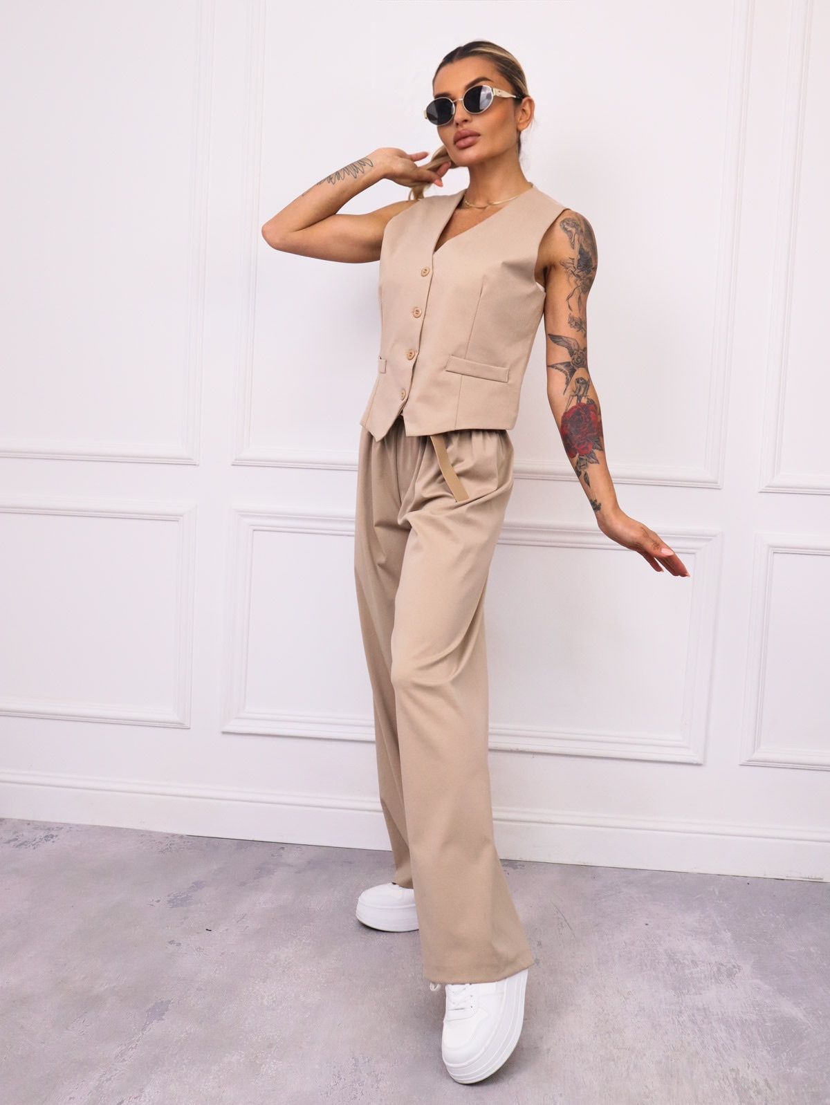 KOMPLET KAMIZELKA+ SPODNIE Z SZEROKIMI NOGAWKAMI I PASKIEM- CIEMNOBEŻOWY