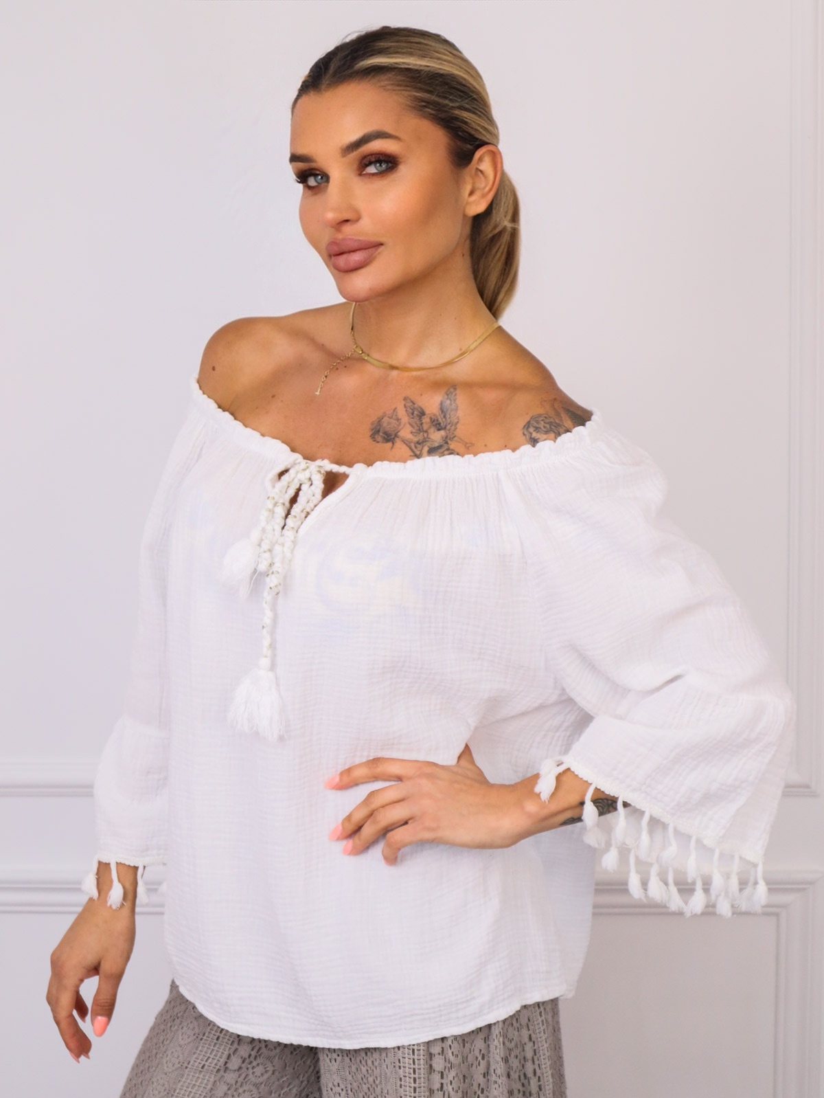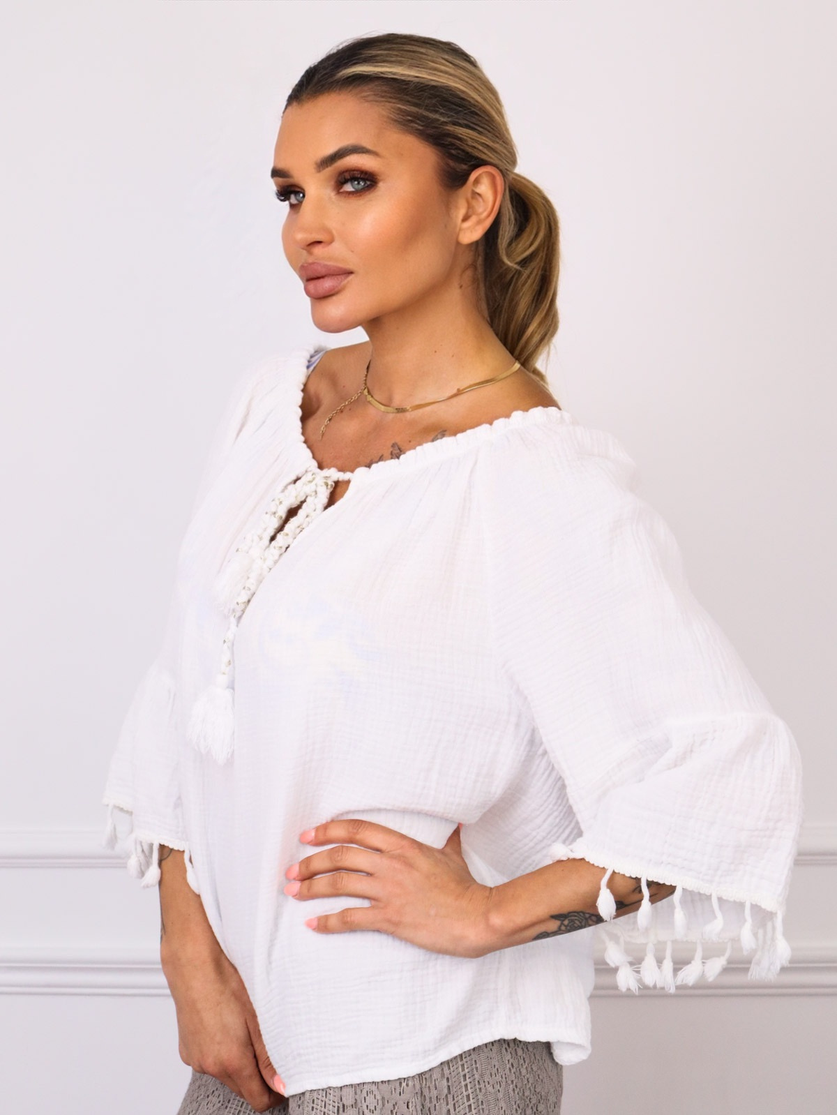 BLUZKA Z WIĄZANIEM I FRĘDZLAMI PRZY RĘKAWACH- BIAŁA