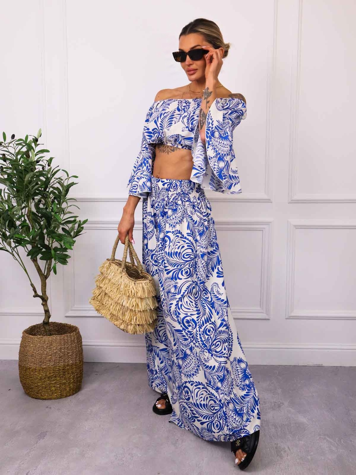 KOMPLET WZORZYSTY TOP+ SPODNIE- NIEBIESKI