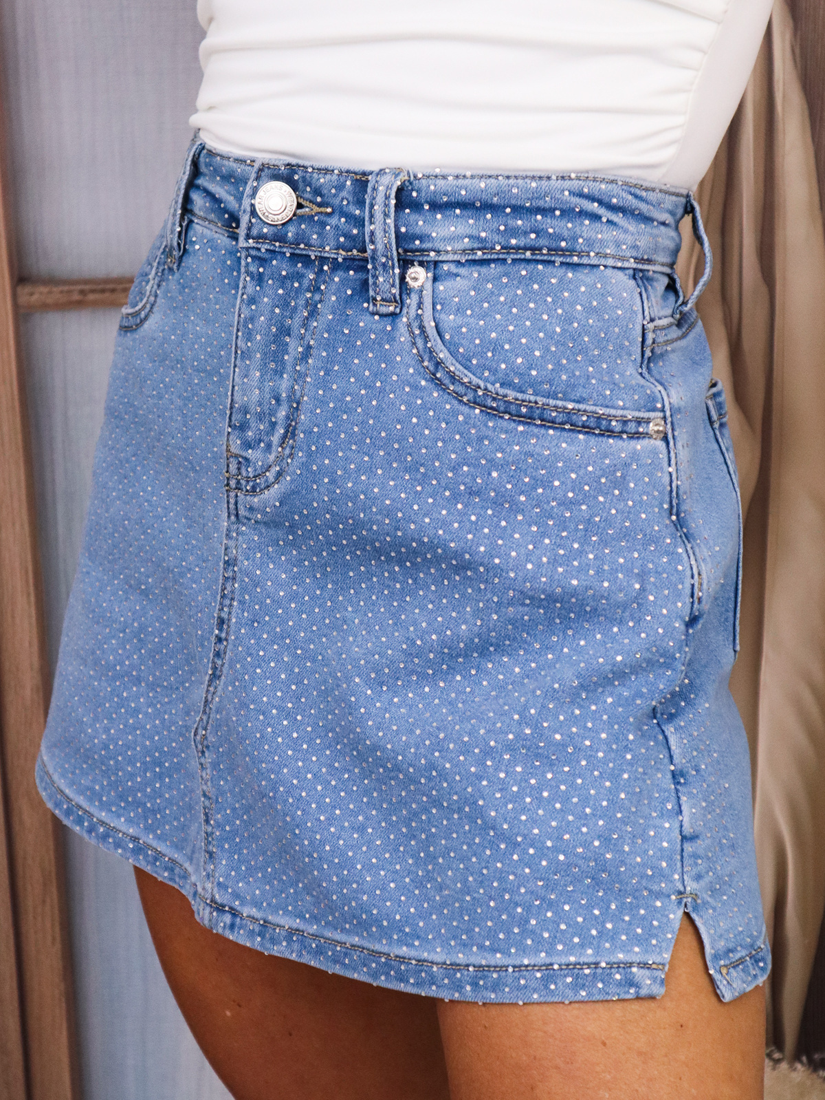 Spódnico-spodenki jeansowe zdobione cyrkoniami.
