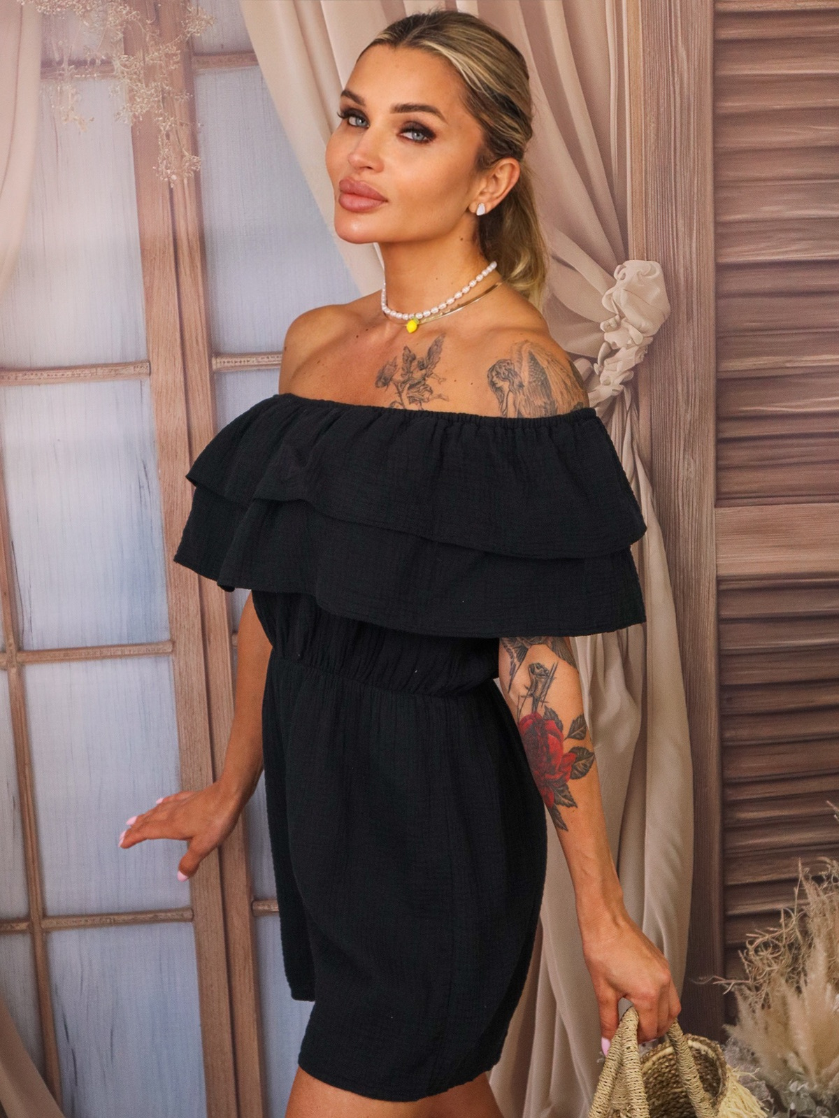 KOMBINEZON MUŚLINOWY HISZPANKA Z FALBANĄ- CZARNY