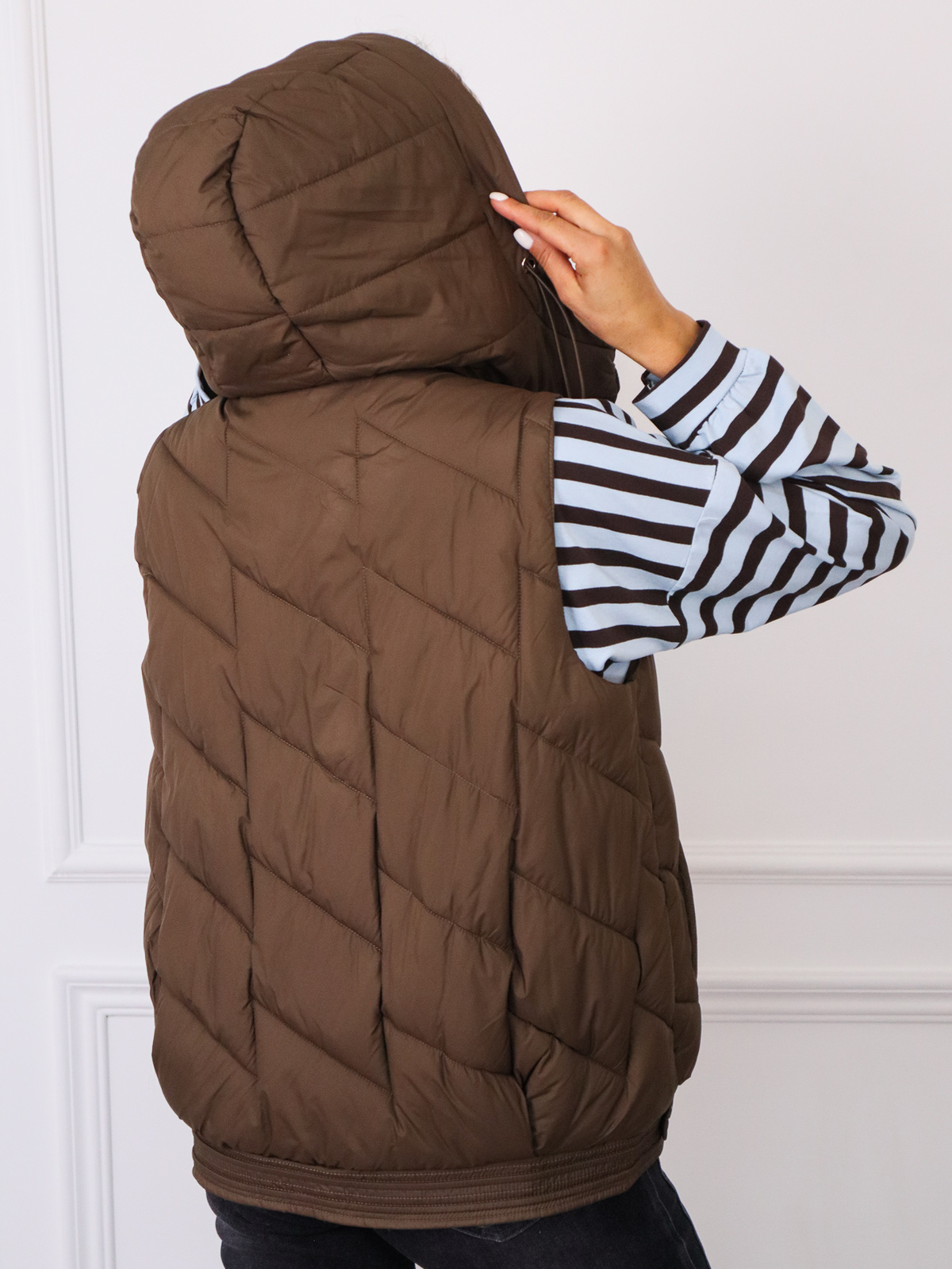 Pikowana kamizelka z nieodpinanym kapturem oraz zatrzaskami po bokach
