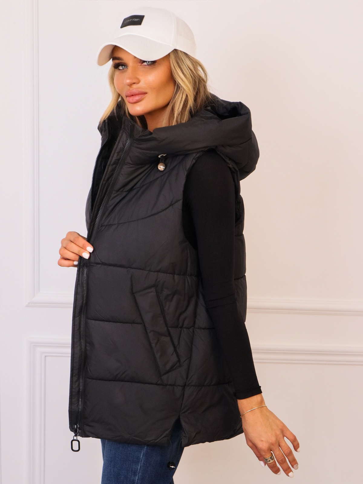 ASYMETRYCZNA KAMIZELKA Z KAPTUREM I ŚCIAGACZEM NA DOLE- CZARNA