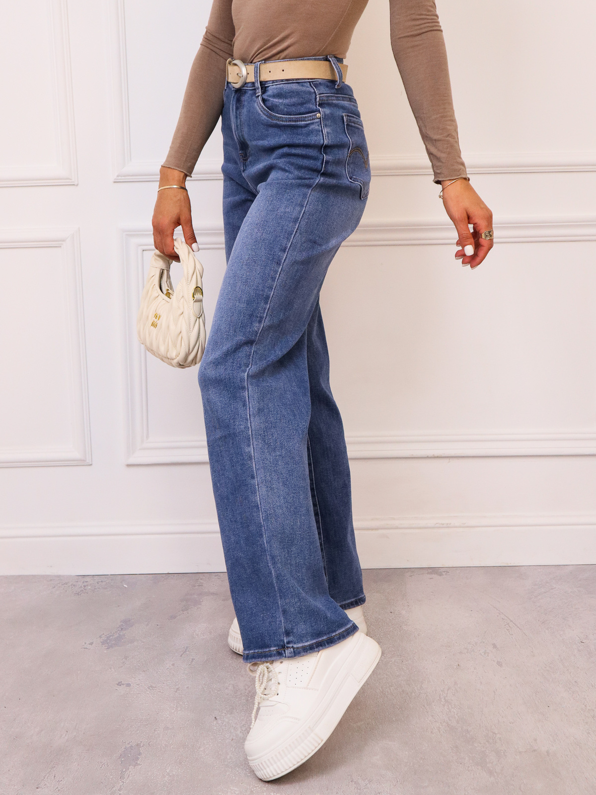 Spodnie jeansowe z szerokimi nogawkami. Kieszenie z przodu i z tyłu. Elastyczny, komfortowy jeans.