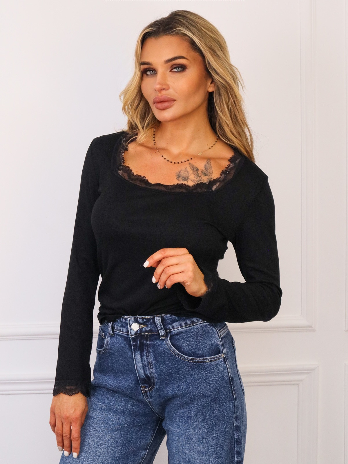 BLUZKA OVERSIZE Z DEKOLTEM CARO I OZDOBNĄ KORONKĄ- CZARNA