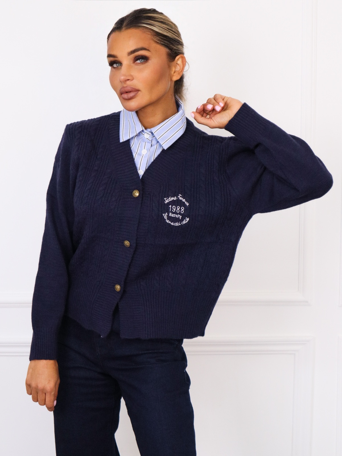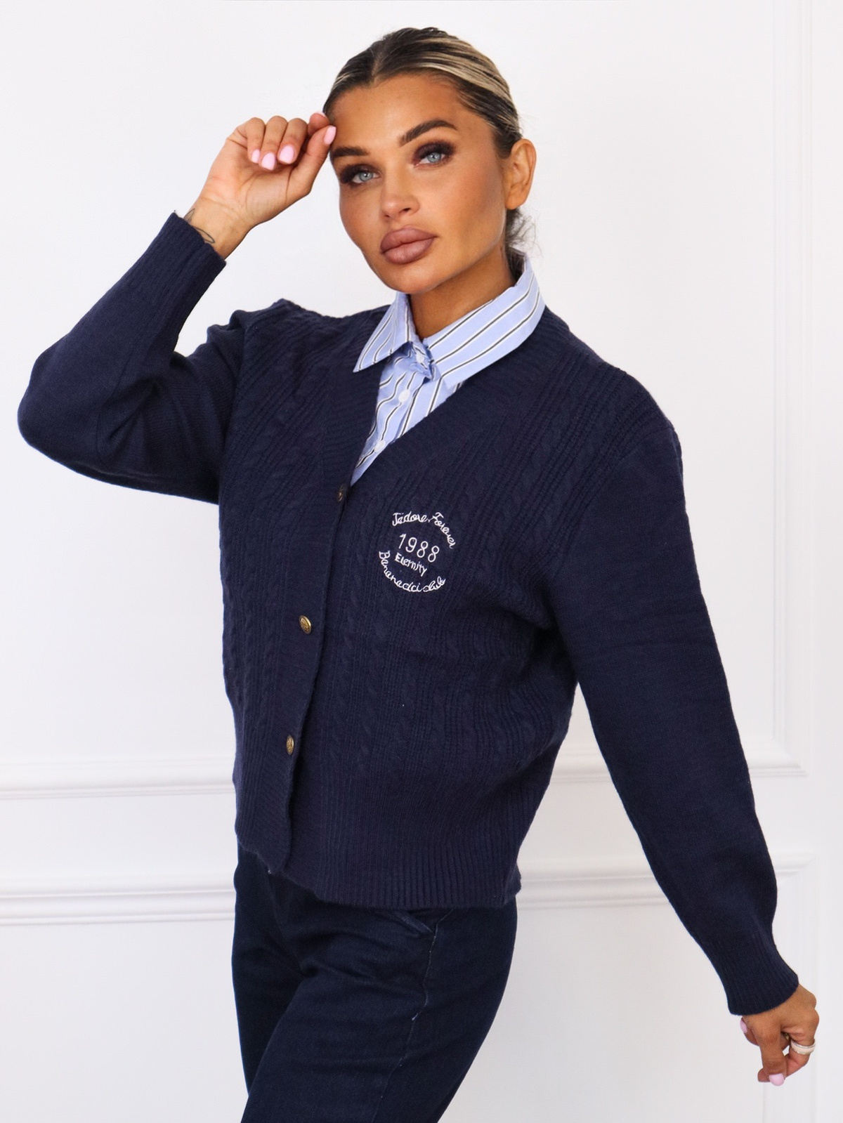 Sweter kardigan zapinany na guziki. Warkoczowy splot i kontrastowe wykończenia. Koszulowa wstawka. Naszywka z przodu.
