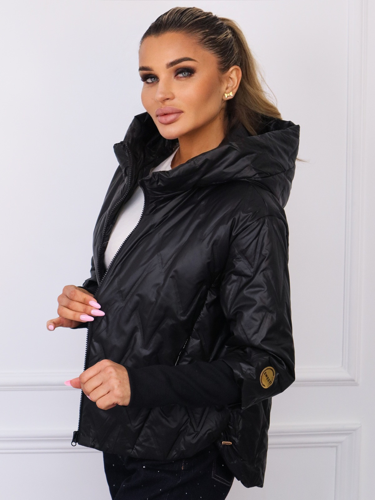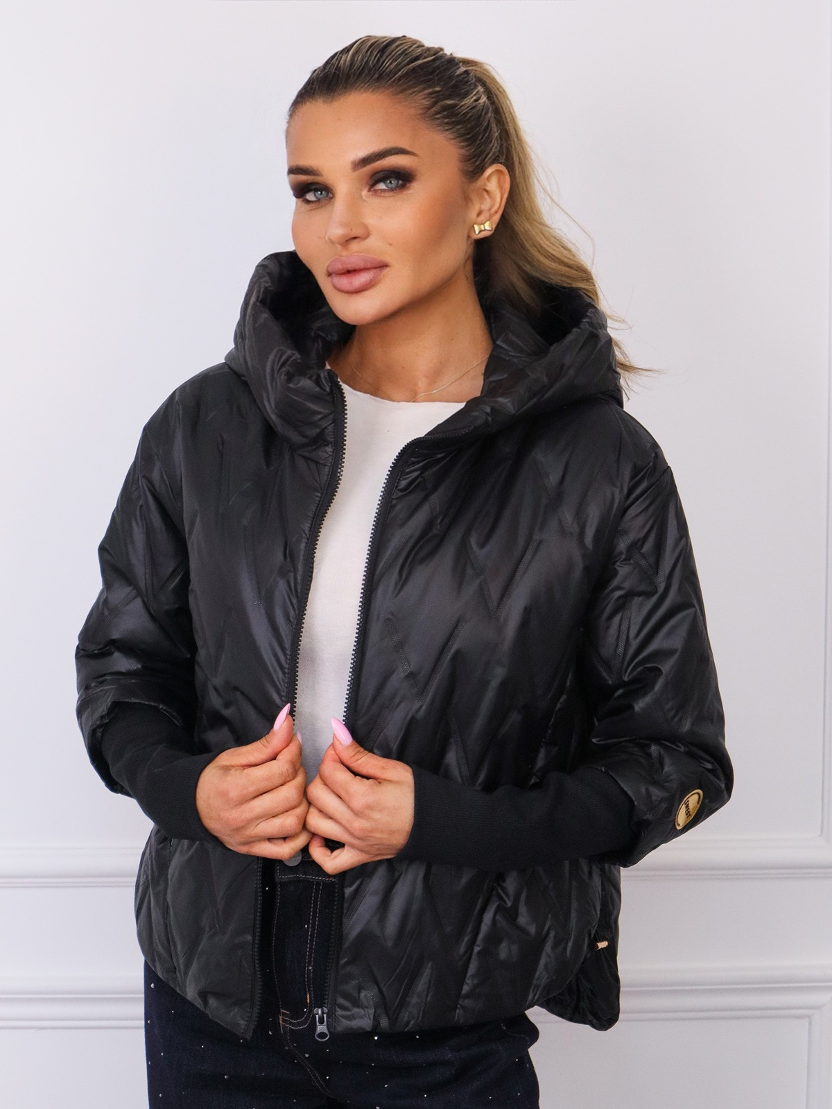Pikowana asymetryczna kurtka z kapturem i ściągaczem na dole. Rękawy zakończone długim ściągaczem.