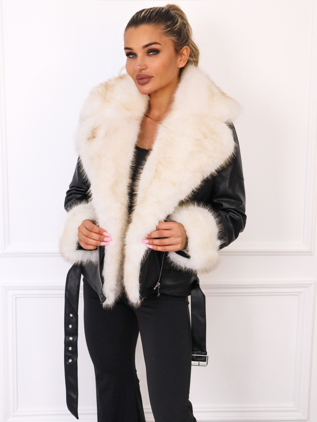 KURTKA Z IMITACJI SKÓRY Z OCIEPLENIEM I OZDOBNYM FUTERKIEM- CZARNA