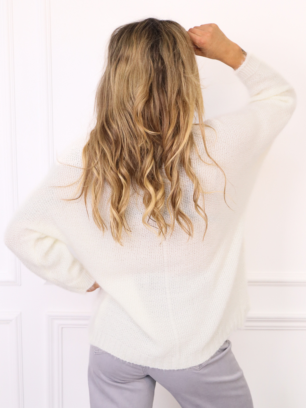 ASYMETRYCZNY SWETER Z DEKOLTEM W SZPIC Z DOMIESZKA WEŁNY I MOHERU- BIAŁY