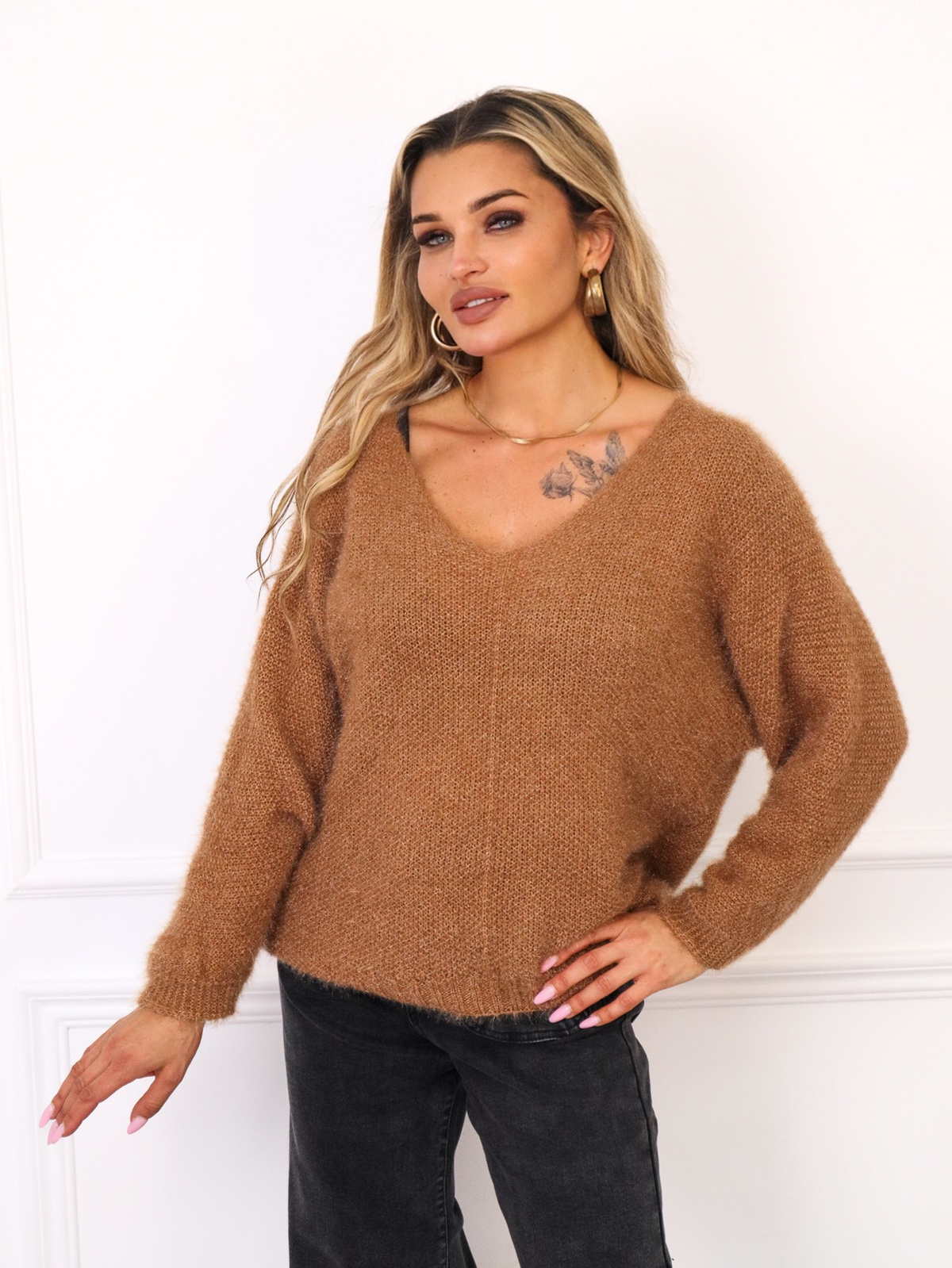 ASYMETRYCZNY SWETER Z DEKOLTEM W SZPIC Z DOMIESZKA WEŁNY I MOHERU- BRĄZOWY