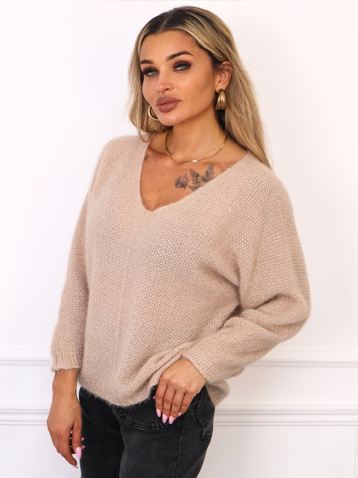 ASYMETRYCZNY SWETER Z DEKOLTEM W SZPIC Z DOMIESZKA WEŁNY I MOHERU- BEŻOWY