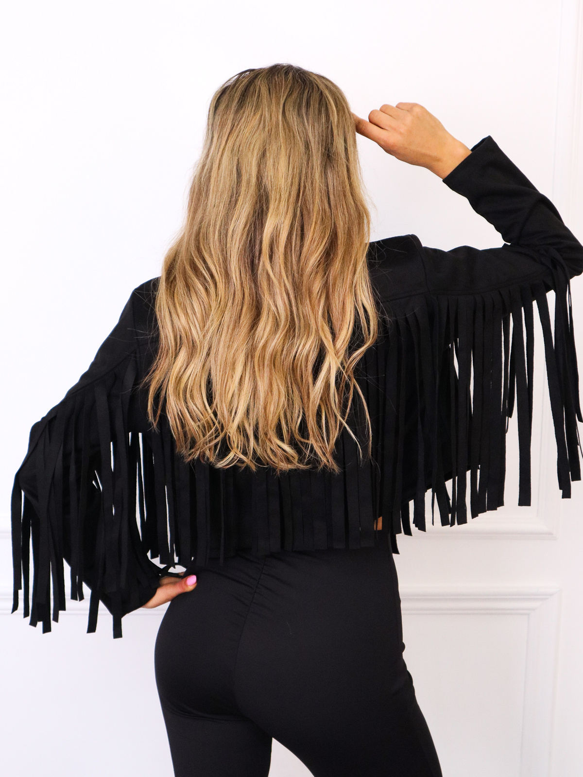 KURTKA Z IMITACJI ZAMSZU Z FRĘDZLAMI- CZARNA