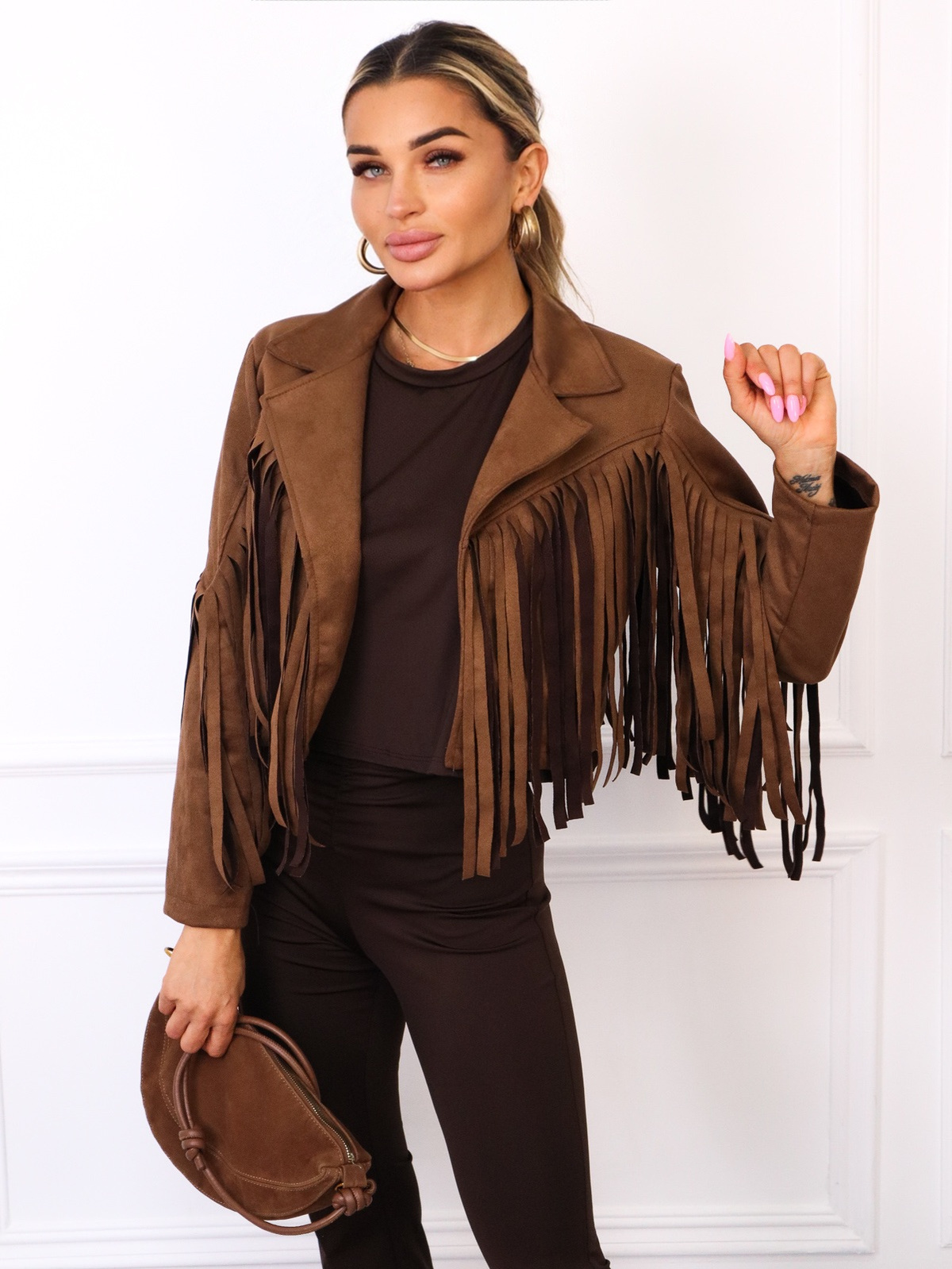 KURTKA Z IMITACJI ZAMSZU Z FRĘDZLAMI- BRĄZOWA
