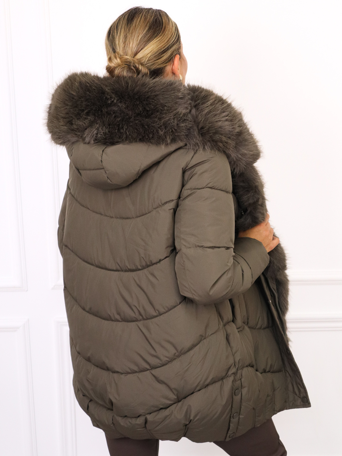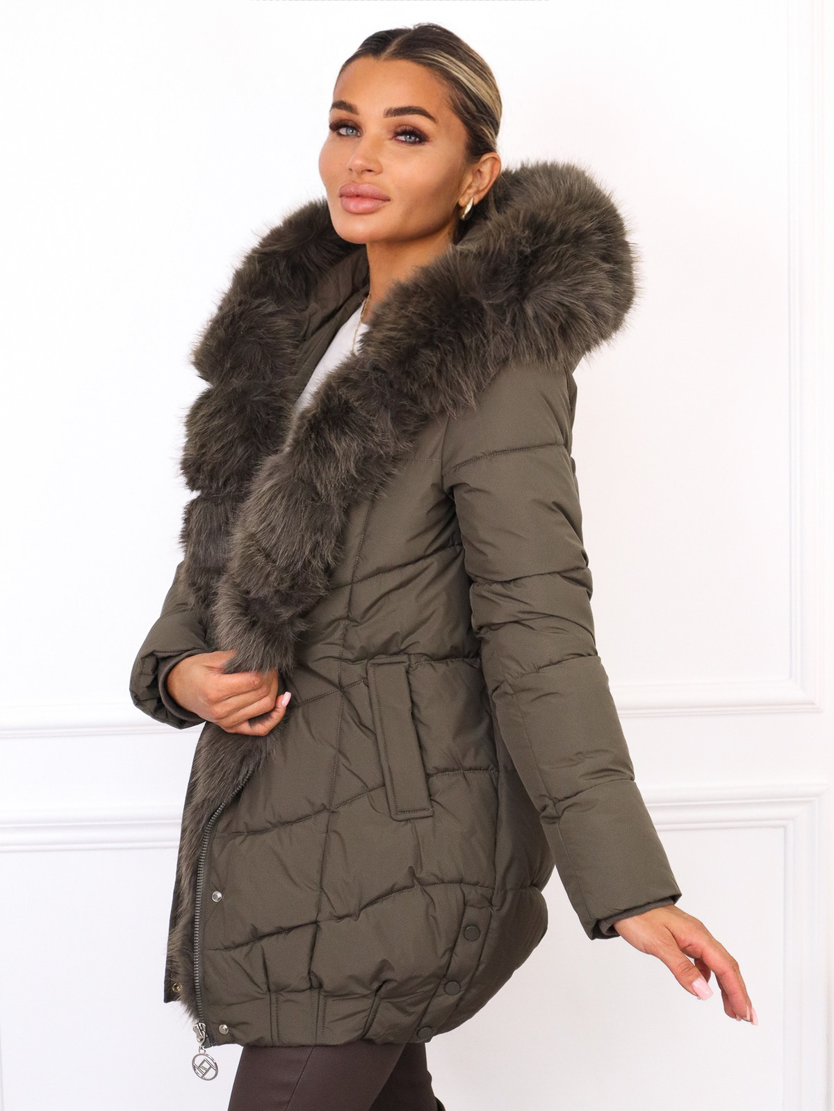 Kurtka pikowana zwężana na dole. Zapinana na zamek i zatrzaski. Odpinane futerko przy kapturze.