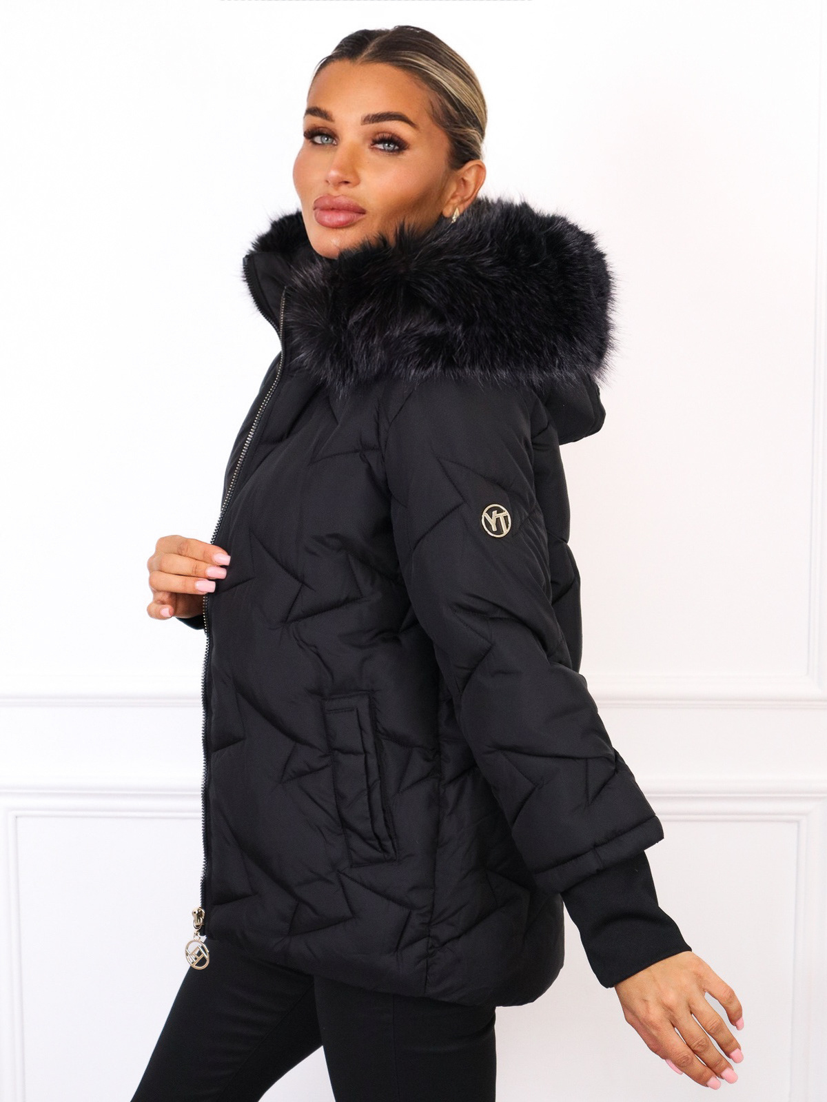 Kurtka asymetryczna z przedłużanymi ściągaczami przy rękawach. Odpinany kaptur i futerko przy kapturze.