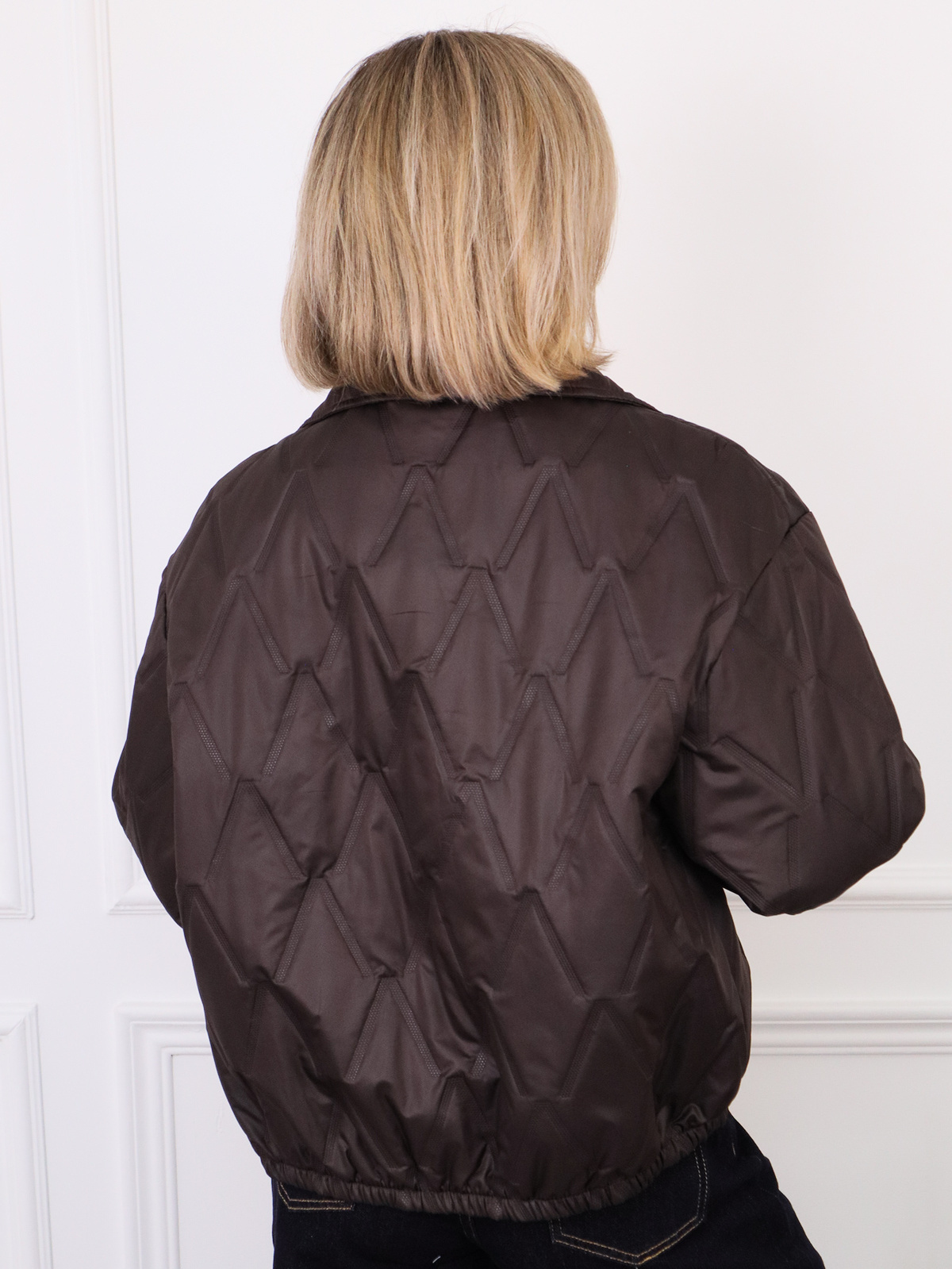 Kurtka przejściowa wykonana z pikowanej tkaniny z ozdobnym wzorem na całej powierzchni. Kurtka zapinana na złote guziki z kołnierzykiem. Na dole posiada gumkę.