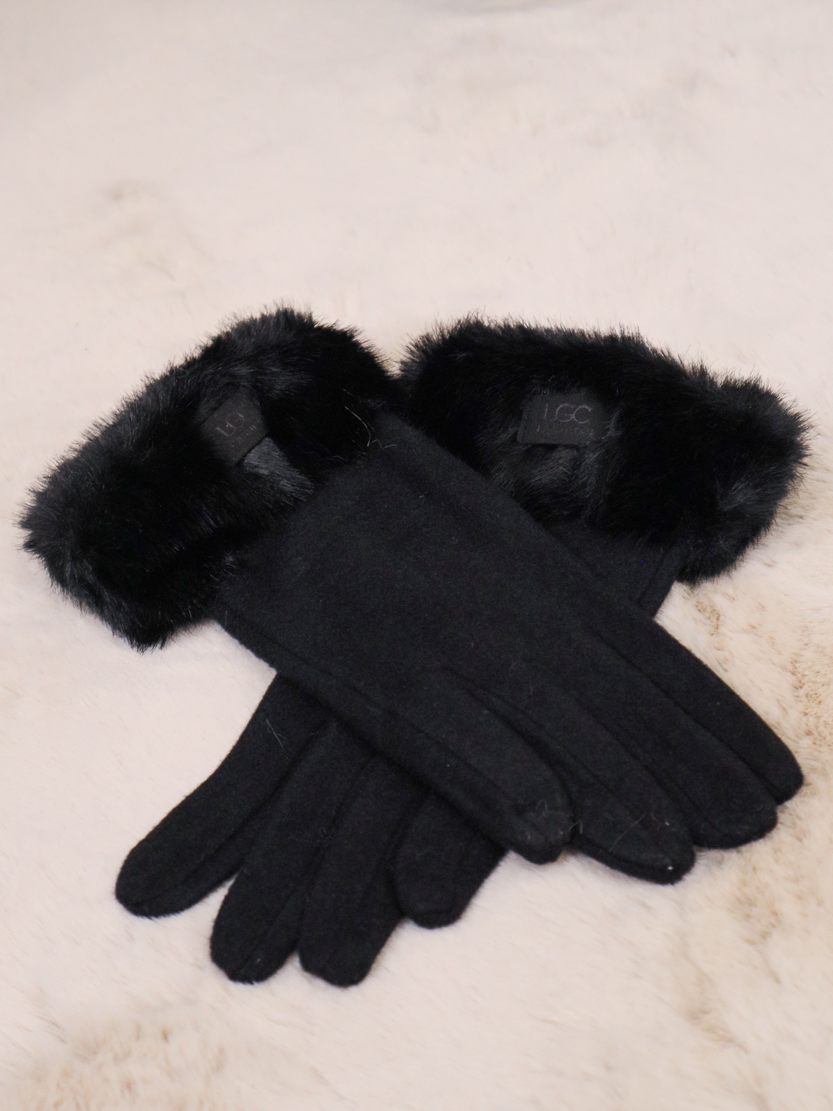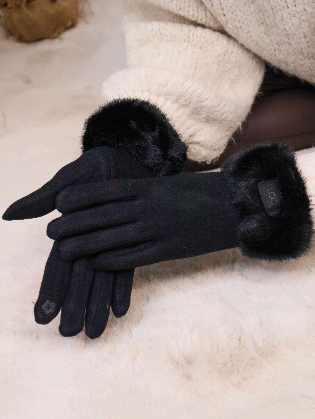 Rękawiczki wykonane z przyjemnej w dotyku dzianiny. Posiadają ozdobne futerko oraz naszywkę. Nie są w środku ocieplone Końcówka palca wskazującego umożliwiającym obsługę ekranów dotykowych