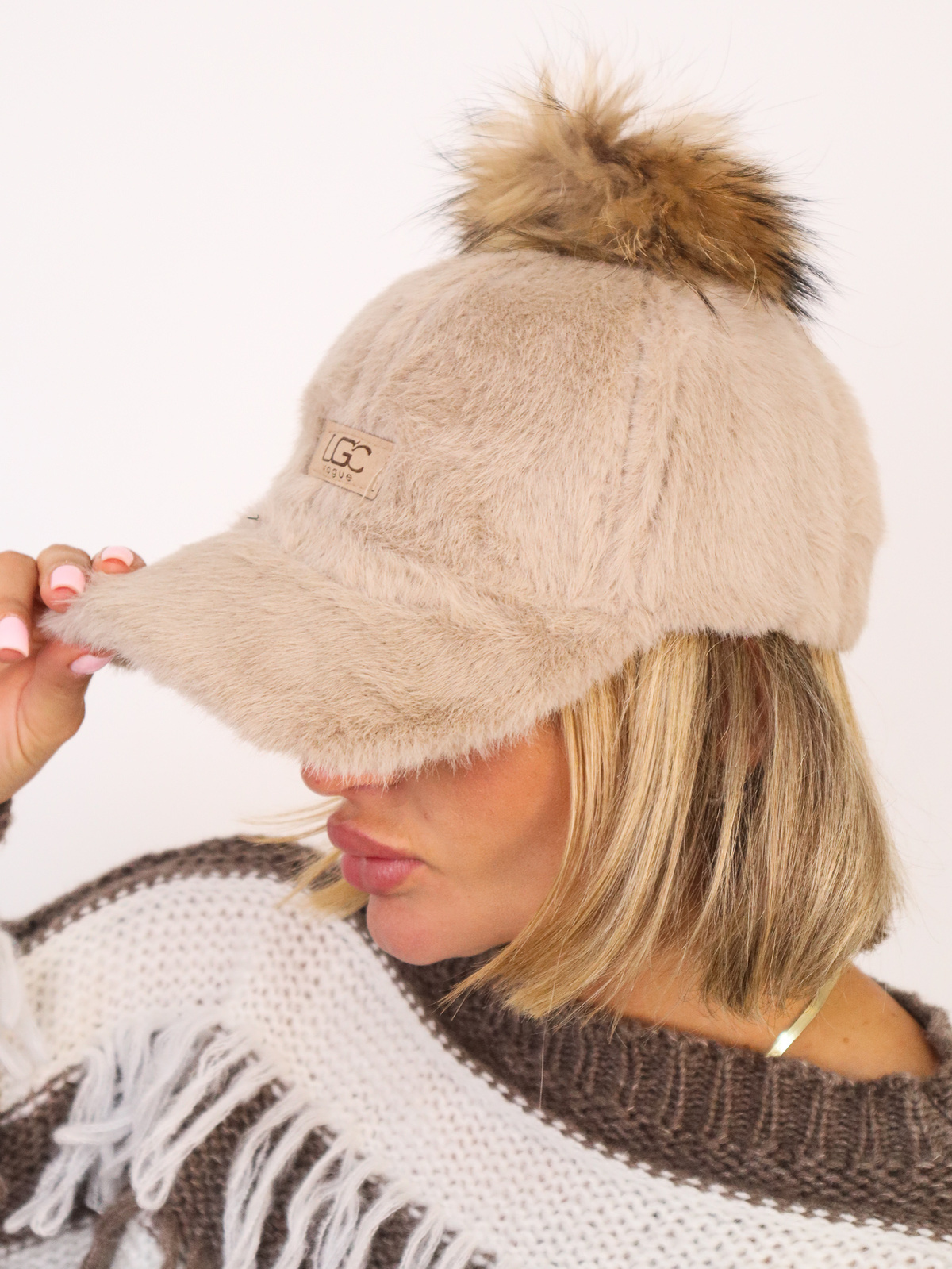 CZAPKA FUTRZANA Z NASZYWKĄ I ODPINANYM POMPONEM- BEŻOWA