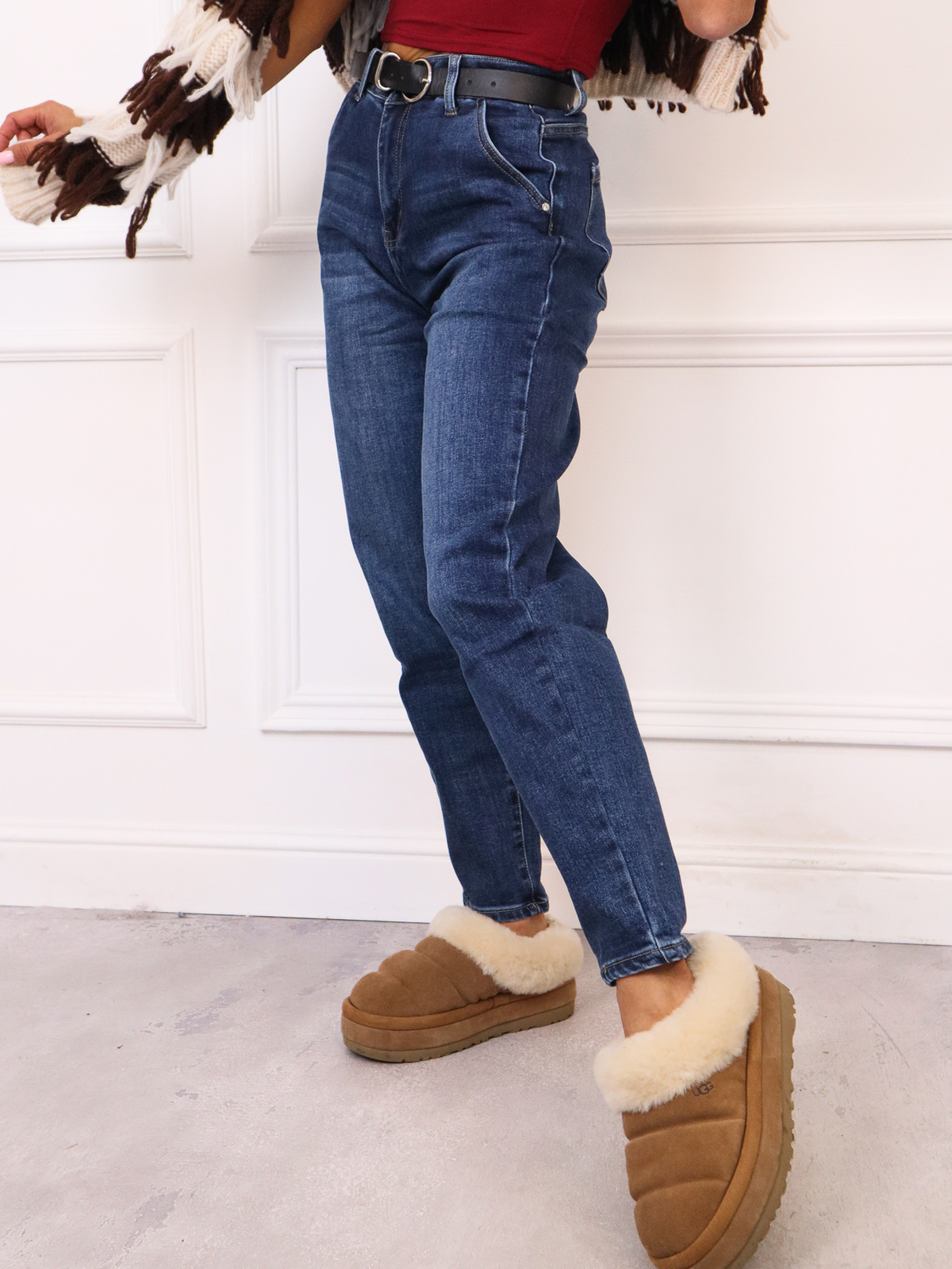 SPODNIE JEANSOWE MOM FIT Z NASZYWKĄ I WYSOKIM STANEM + PASEK- GRANATOWE