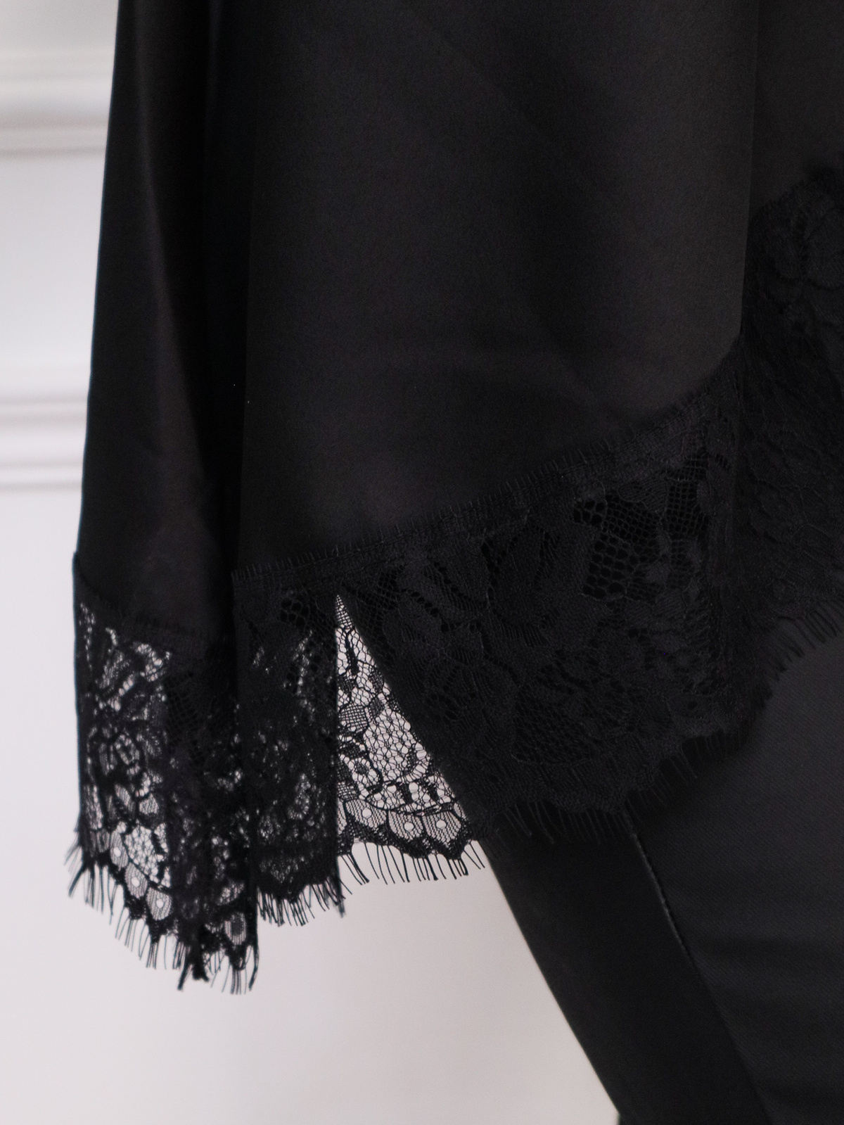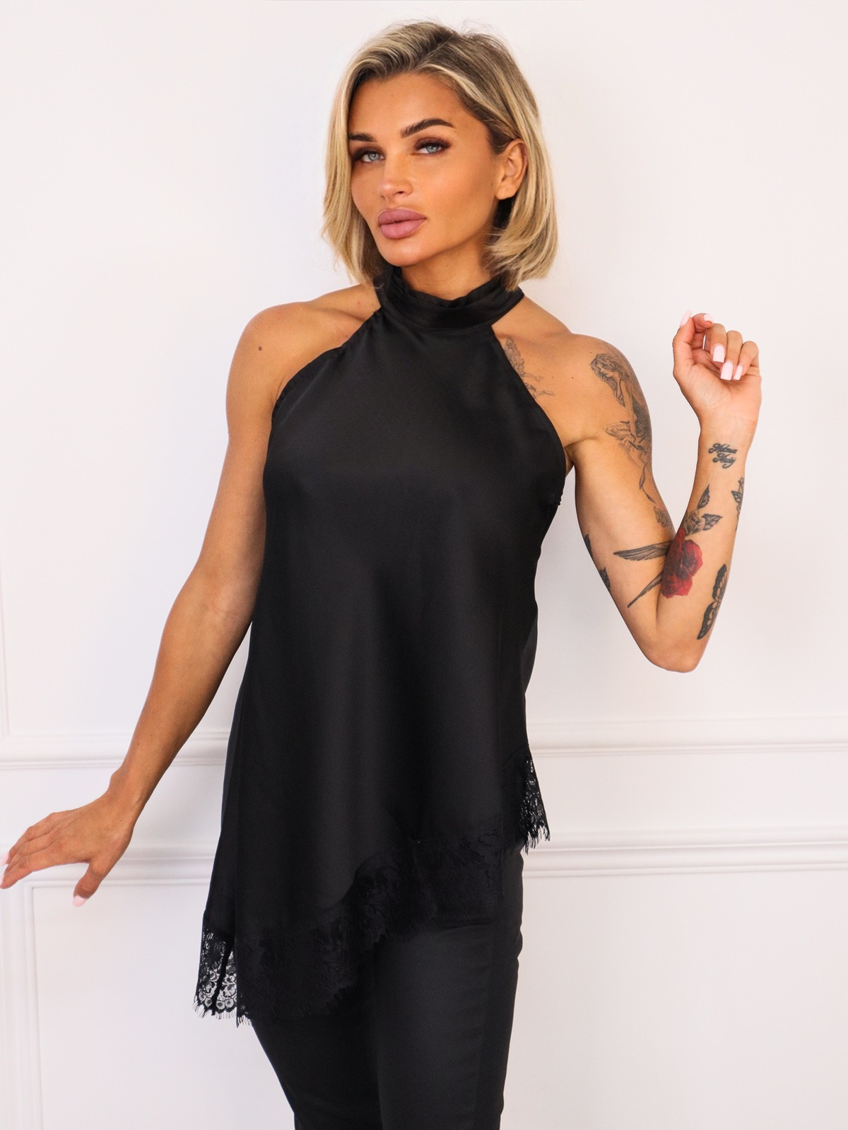 ASYMETRYCZNY TOP SATYNOWY Z WYSOKIM KOŁNIERZEM I KORONKOWĄ LAMÓWKĄ- CZARNY