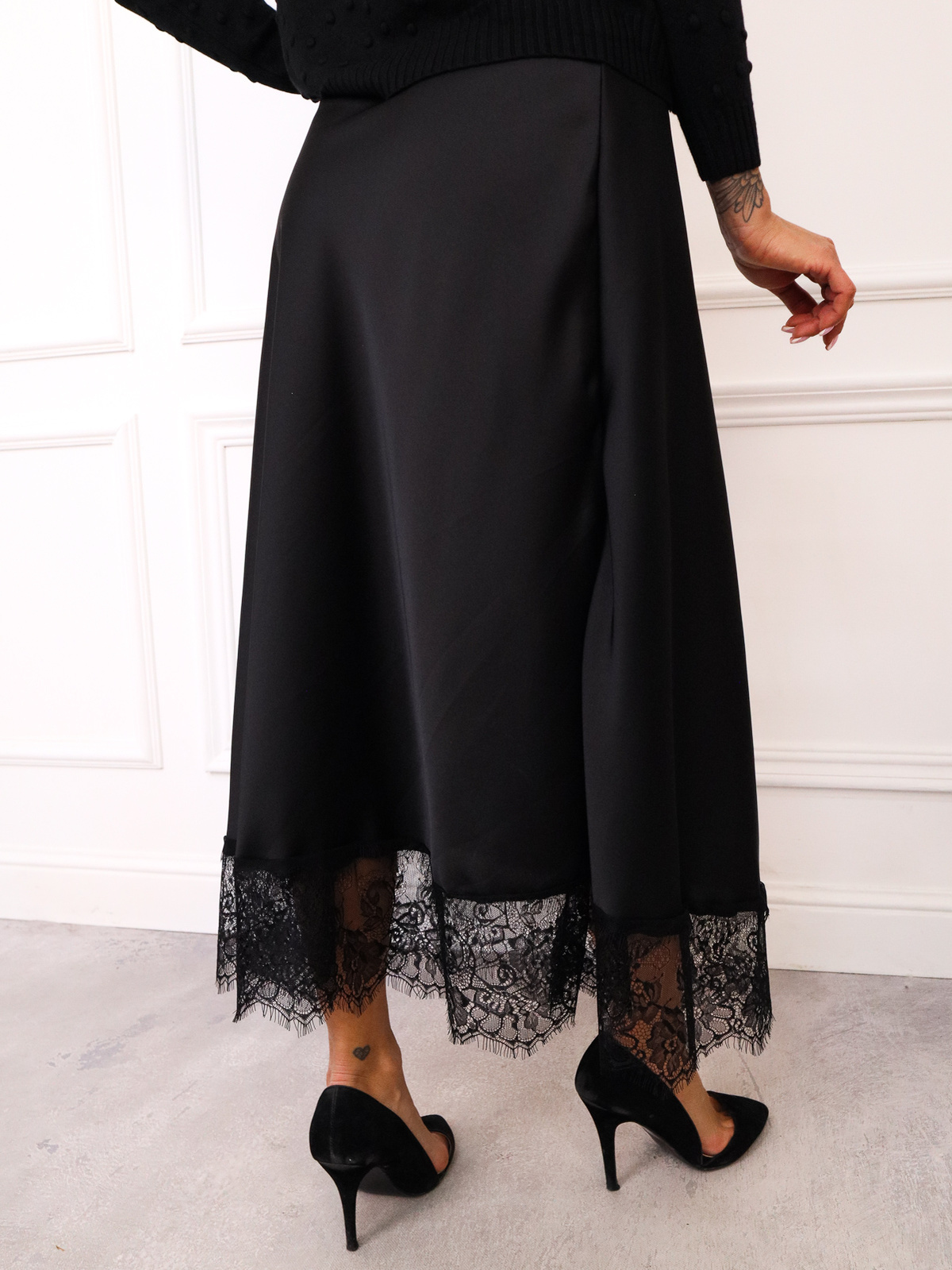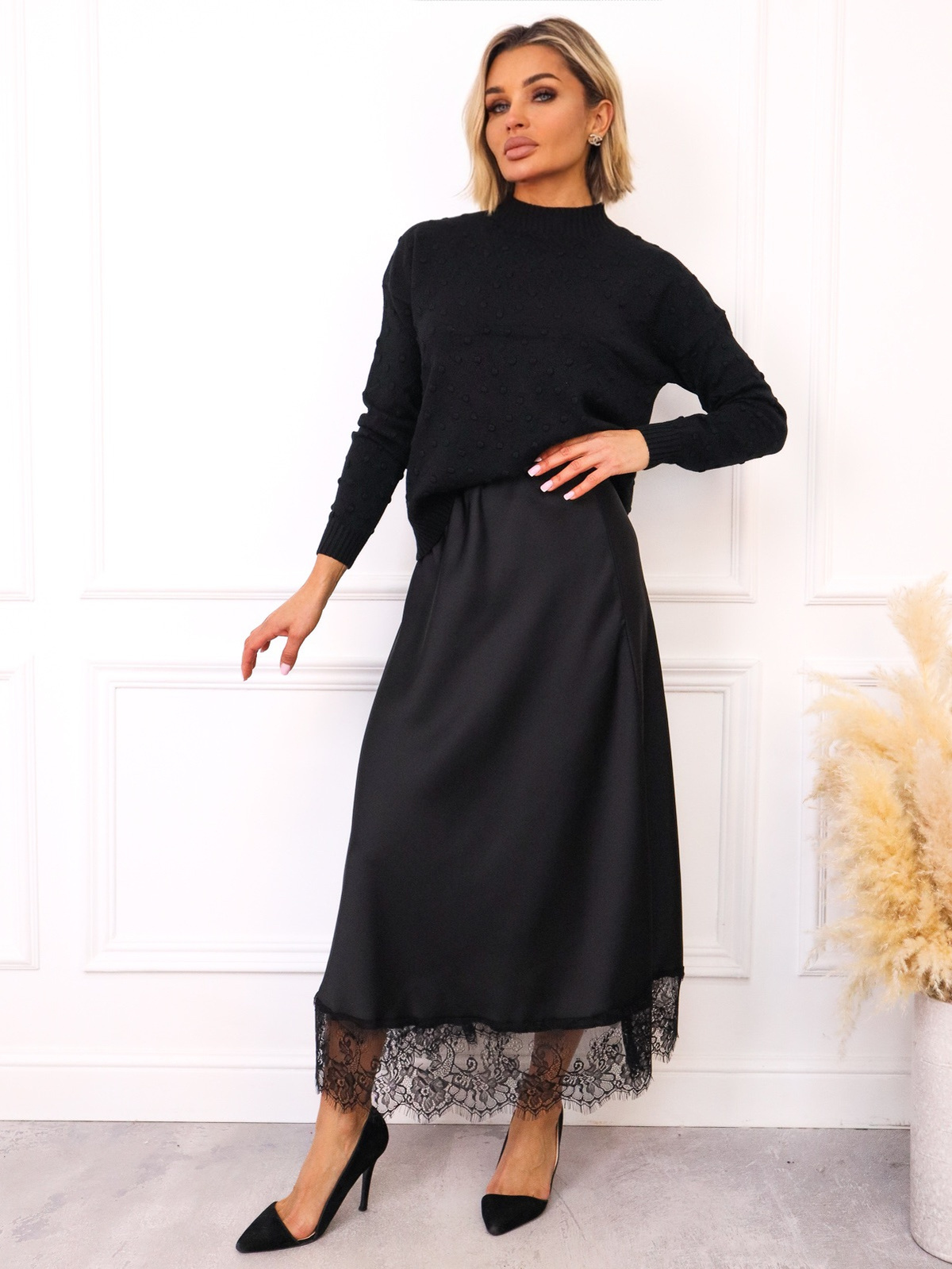 SPÓDNICA SATYNOWA MAXII ZAKOŃCZONA KORONKĄ- CZARNA