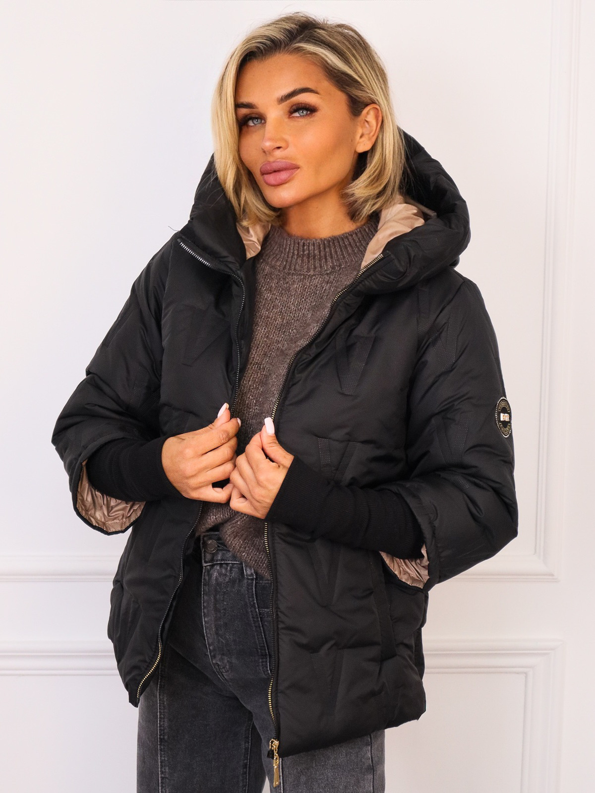 KURTKA ASYMETRYCZNA Z PRZEDŁUŻONYMI ŚCIĄGACZAMI PRZY RĘKAWACH- CZARNA
