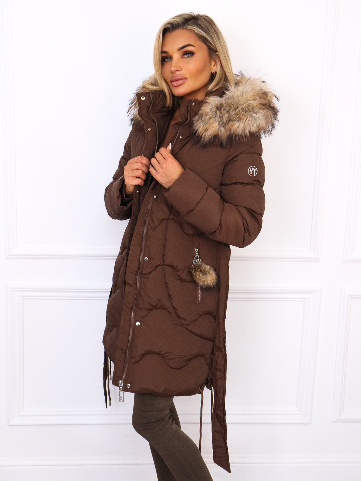 DŁUGA KURTKA PŁASZCZ WIĄZANY W PASIE Z FUTERKIEM- CZEKOLADOWA