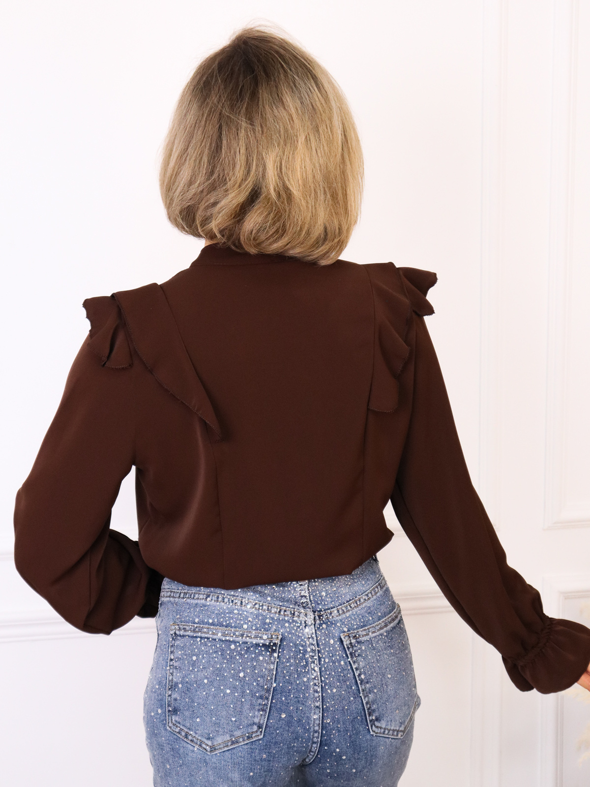 KOSZULA Z FALBANAMI I OZDOBNĄ BROSZKĄ- CZEKOLADOWA