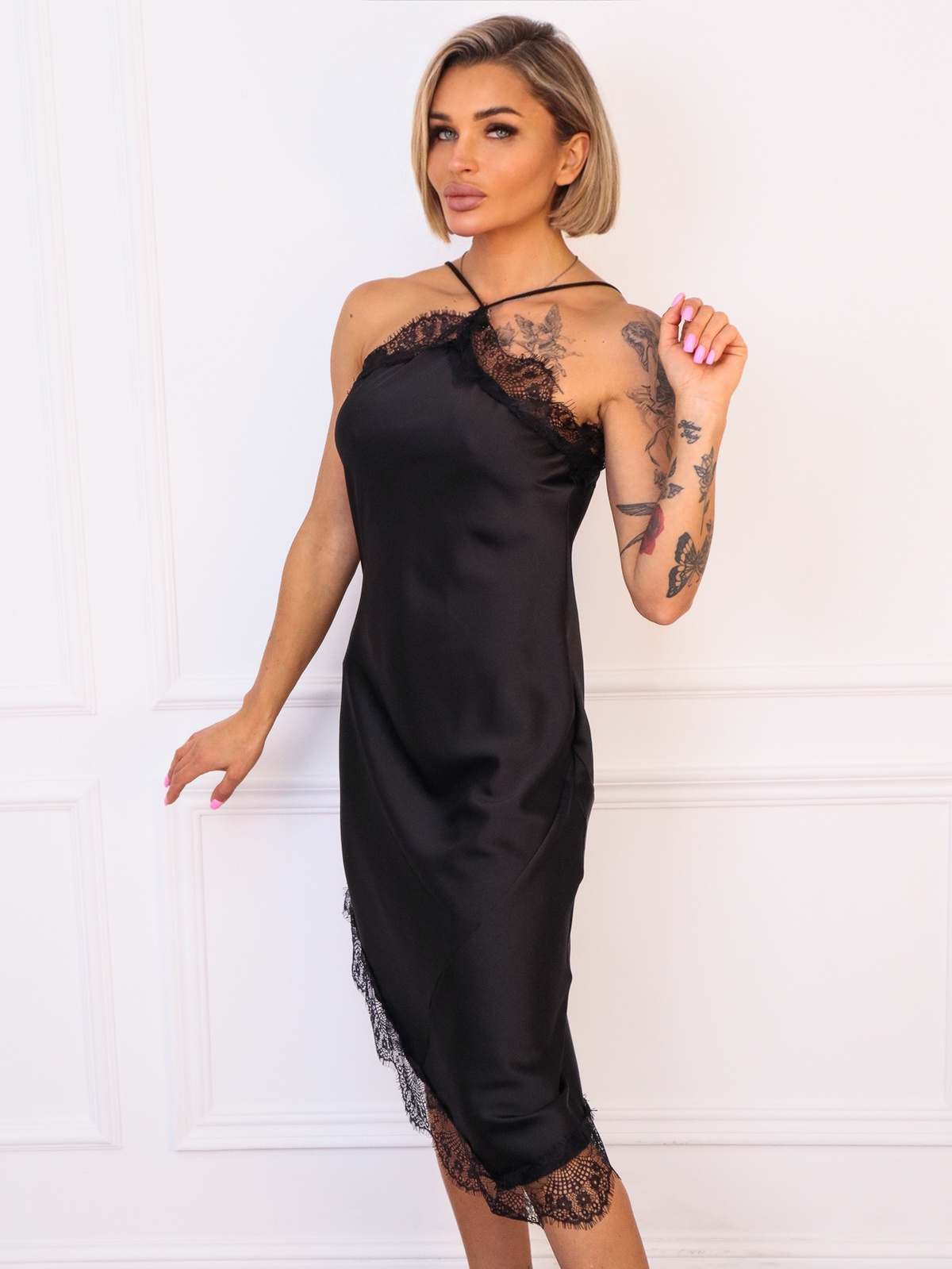 SUKIENKA SATYNOWA Z KORONKĄ I DEKOLTEM HALTER- CZARNA