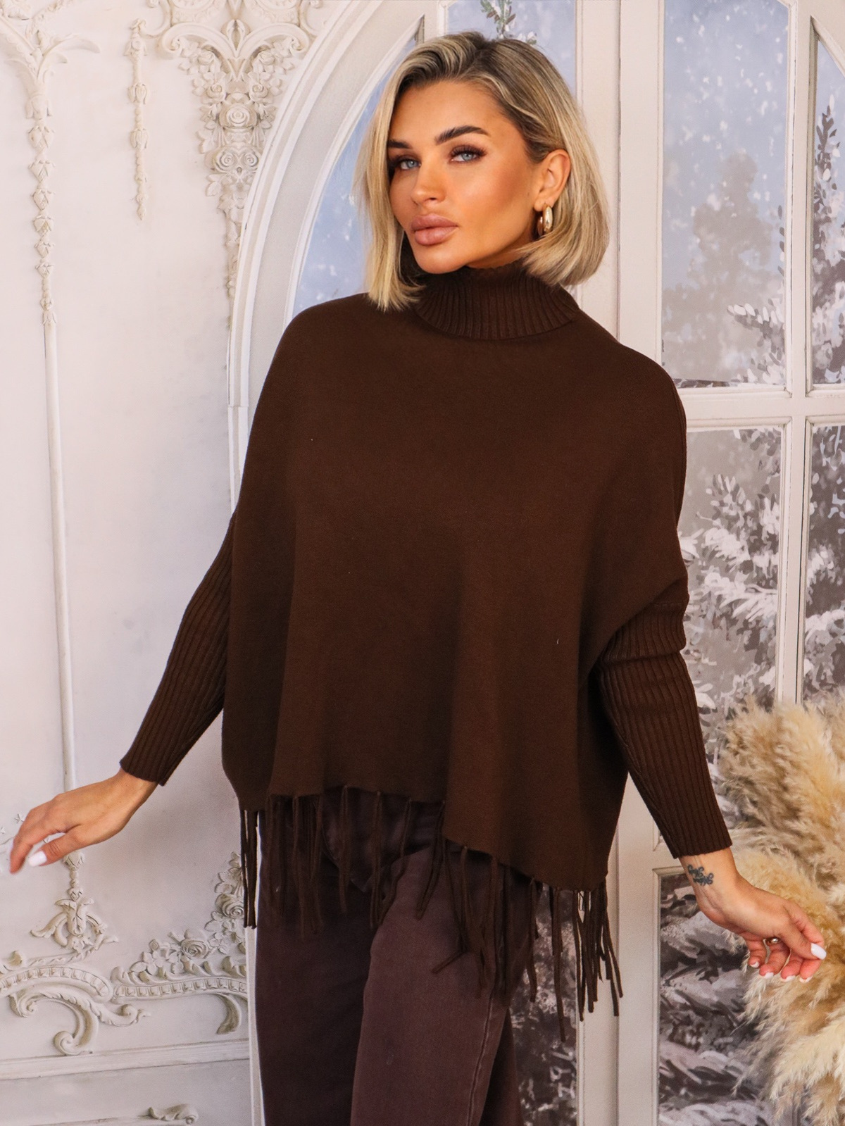 SWETER Z GOLFEM I FRĘDZLAMI NA DOLE- CZEKOLADOWY