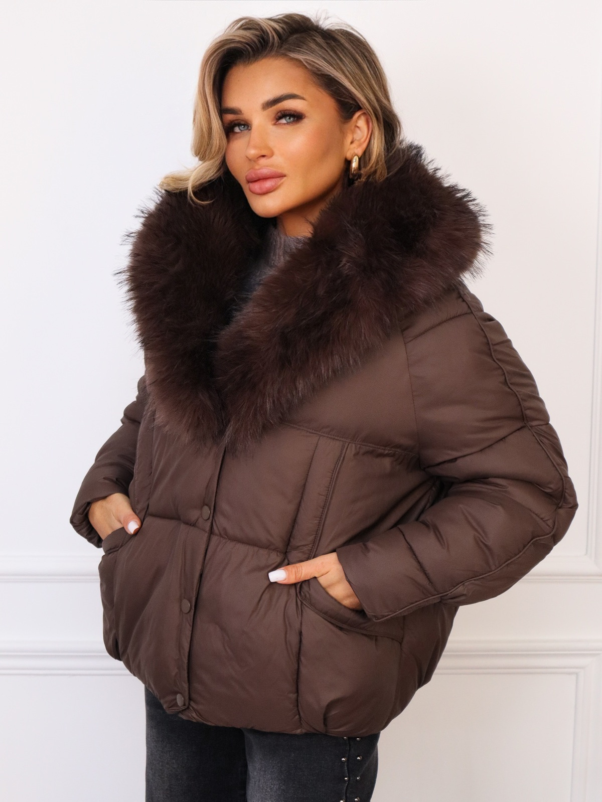 KURTKA Z FUTERKIEM ZAPINANA NA ZAMEK I ZATRZASKI- CZEKOLADOWA