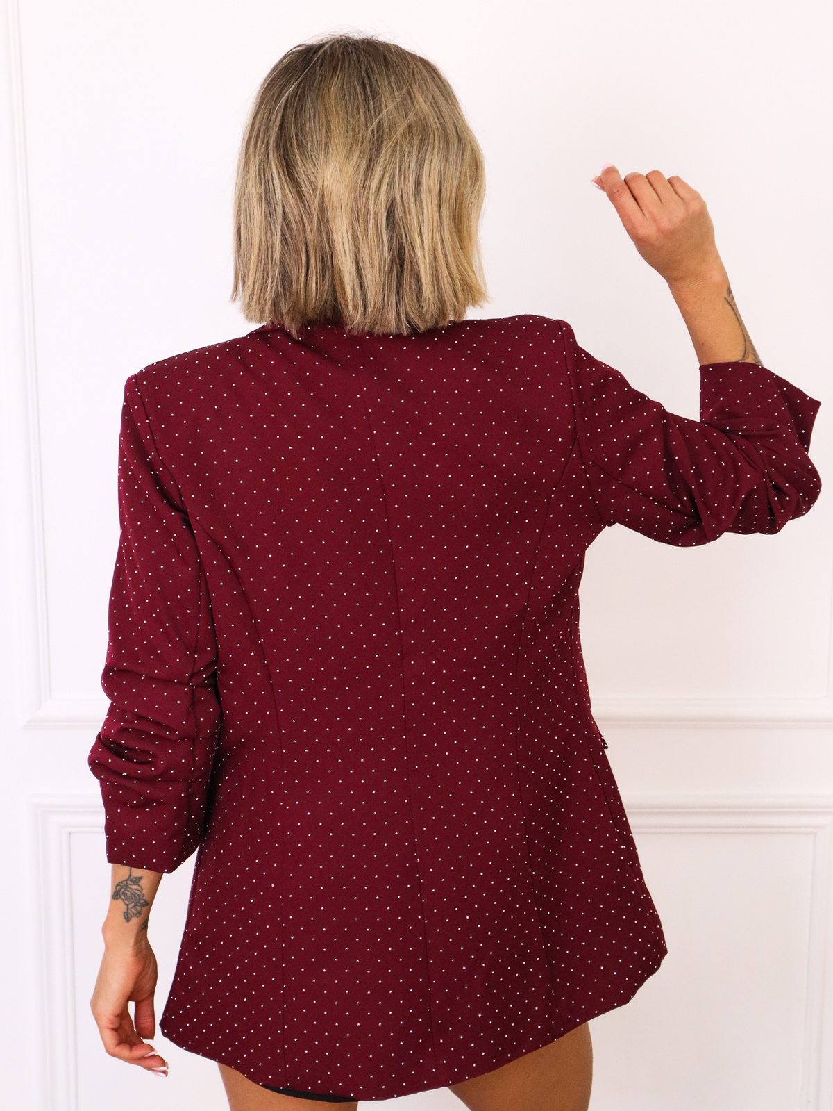 Marynarka onesize zdobiona cyrkoniami. Rękaw 3/4 z marszczeniem.