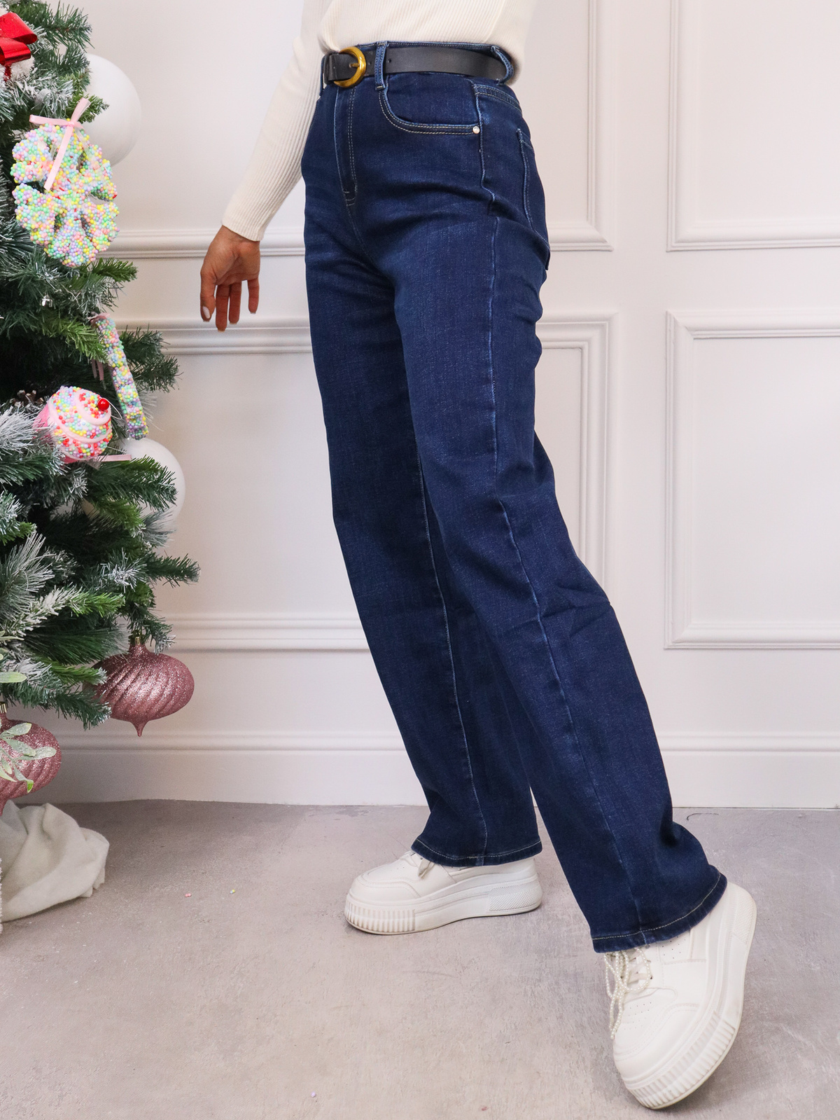 Dżinsy z 5 kieszeniami z bawełnianego denimu. Wysoki stan, rozporek na suwak i guzik. Proste szerokie nogawki.. Pasek gratis.