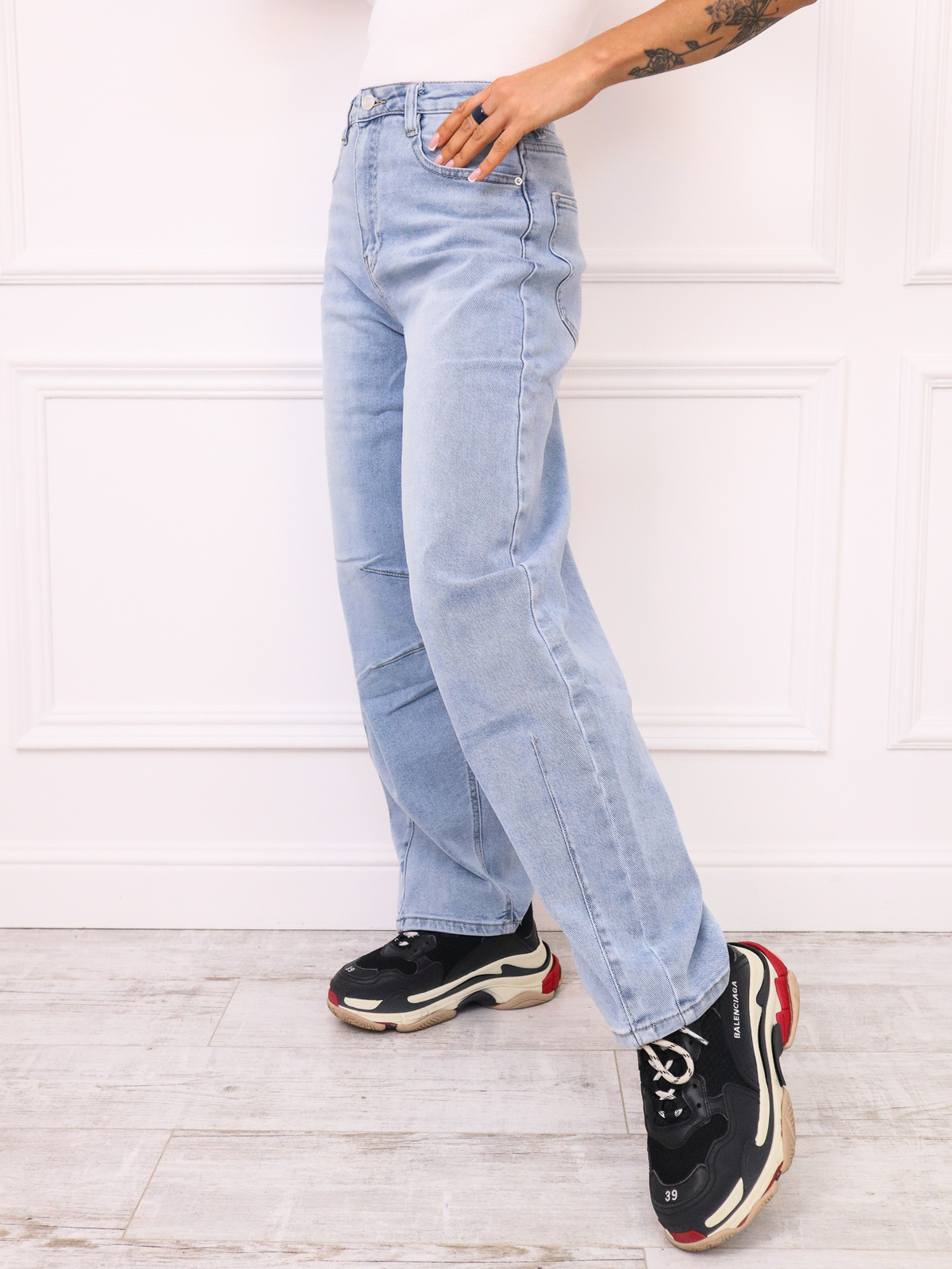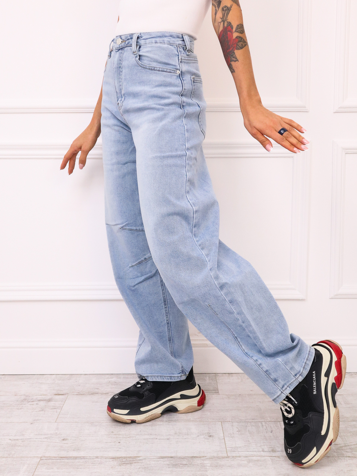 Spodnie jeansowe typu balloon z przeczyciami na kolanach oraz na dole nogawki.. Posiadają luźny stani są luźniejsze w okolicach bioder i ud, a nogawki zwężają się ku dołowi.