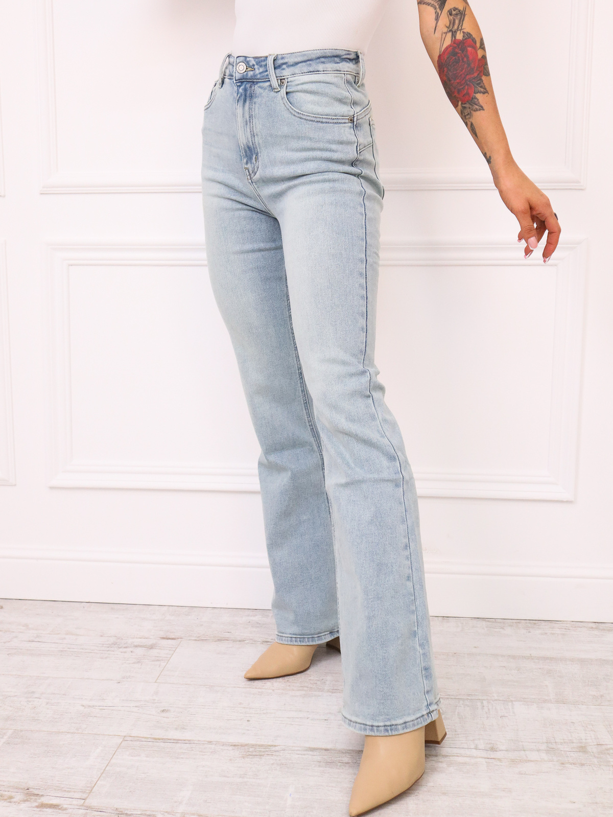Dżinsy z lekko elastycznego denimu. Wysoki stan, rozporek na suwak i guzik. Szeroki rozszerzany dół nogawek.