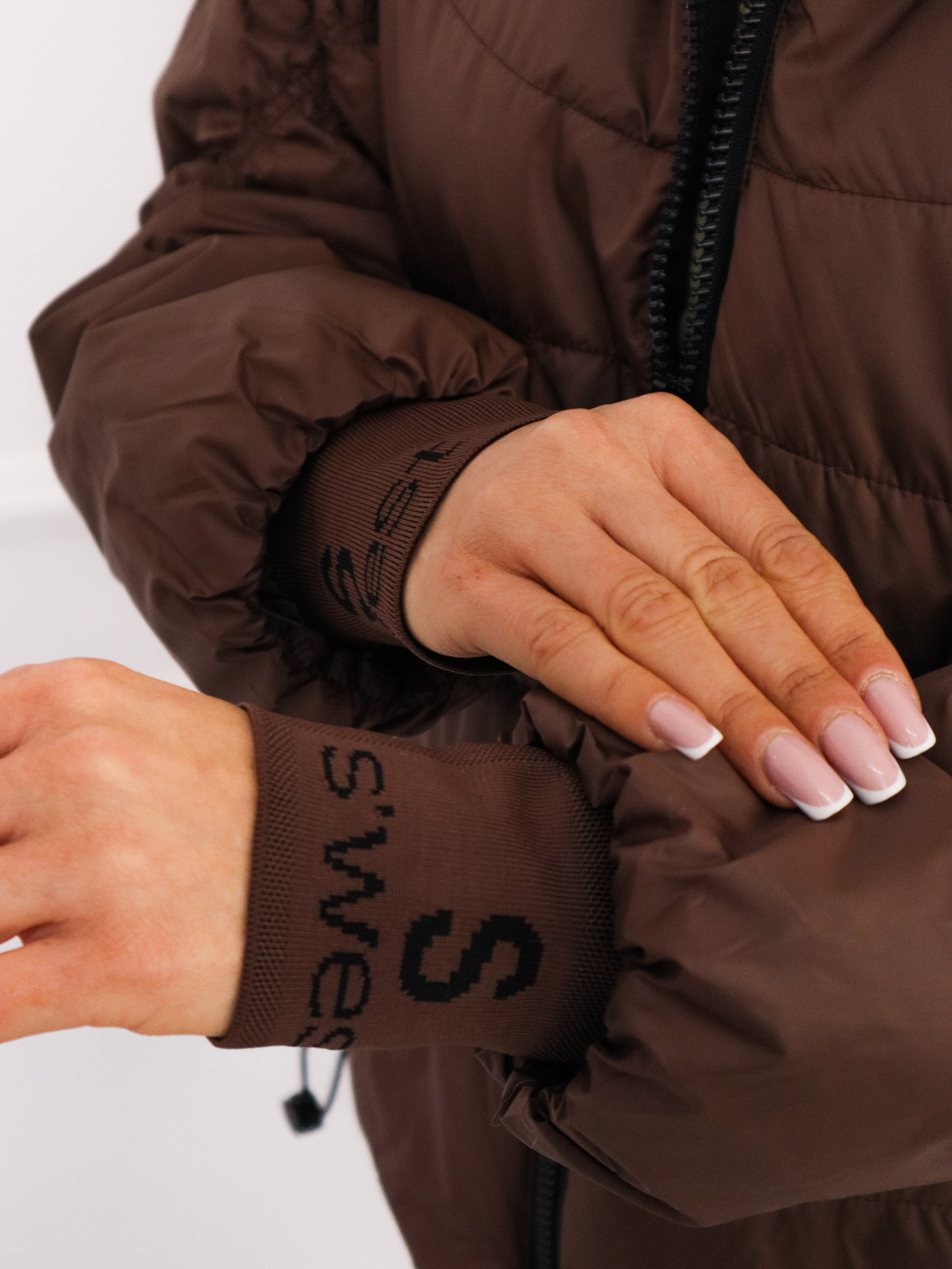 Kurtka przejściowa z ozdobnymi przeszyciami na rękawach i przedłużanym ściągaczem z aplikacją.