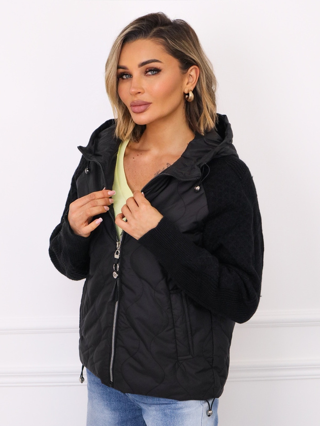 Kurtka przejściowa z kapturem, wykonana z pikowanej tkaniny. Sweterkowe rękawy.