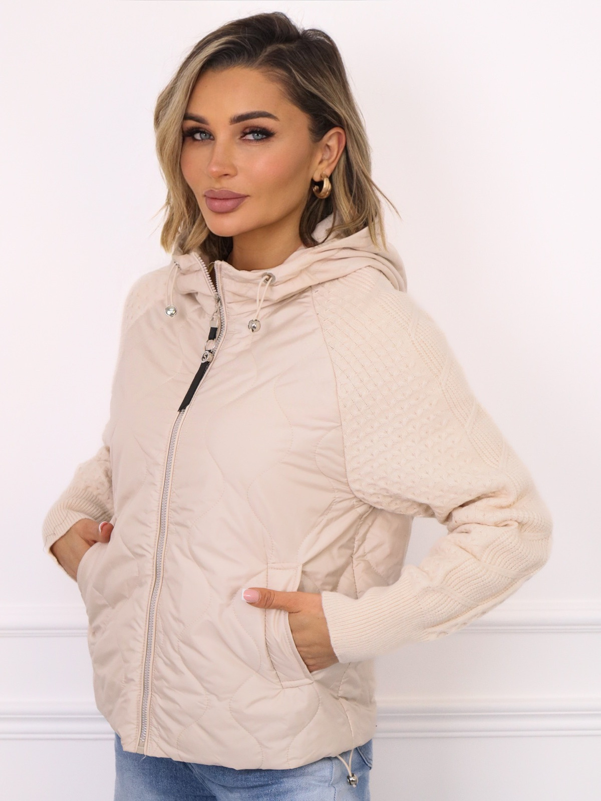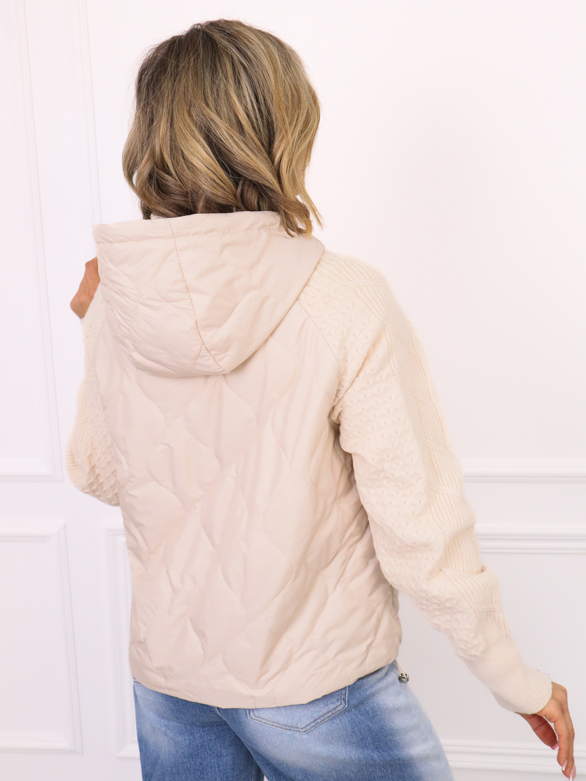 Kurtka przejściowa z kapturem, wykonana z pikowanej tkaniny. Sweterkowe rękawy.