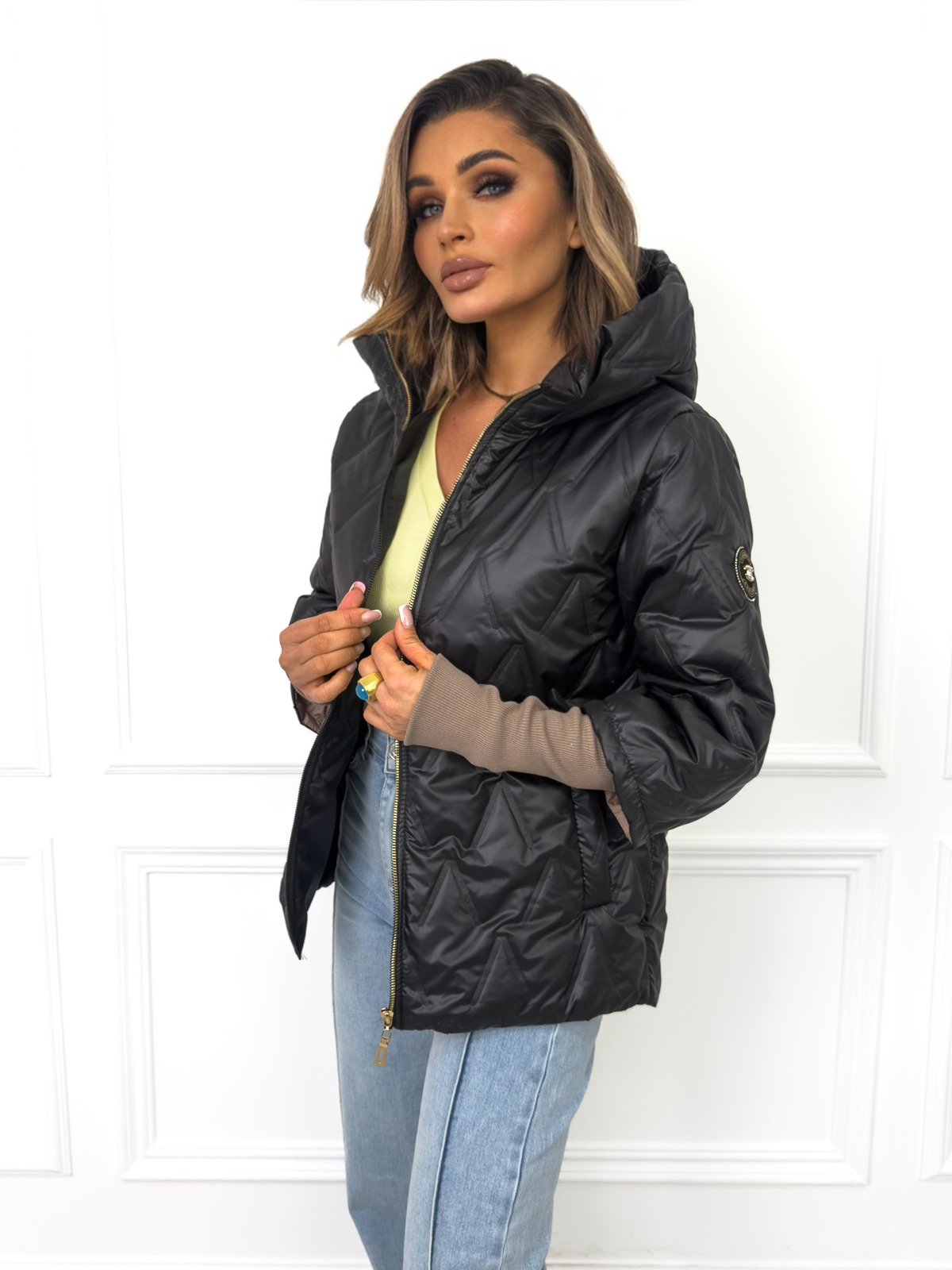 Kurtka przejściowa z kapturem i dłuższymi ściągaczami przy rękawach. Asymetryczny model z kontrastową podszewką.