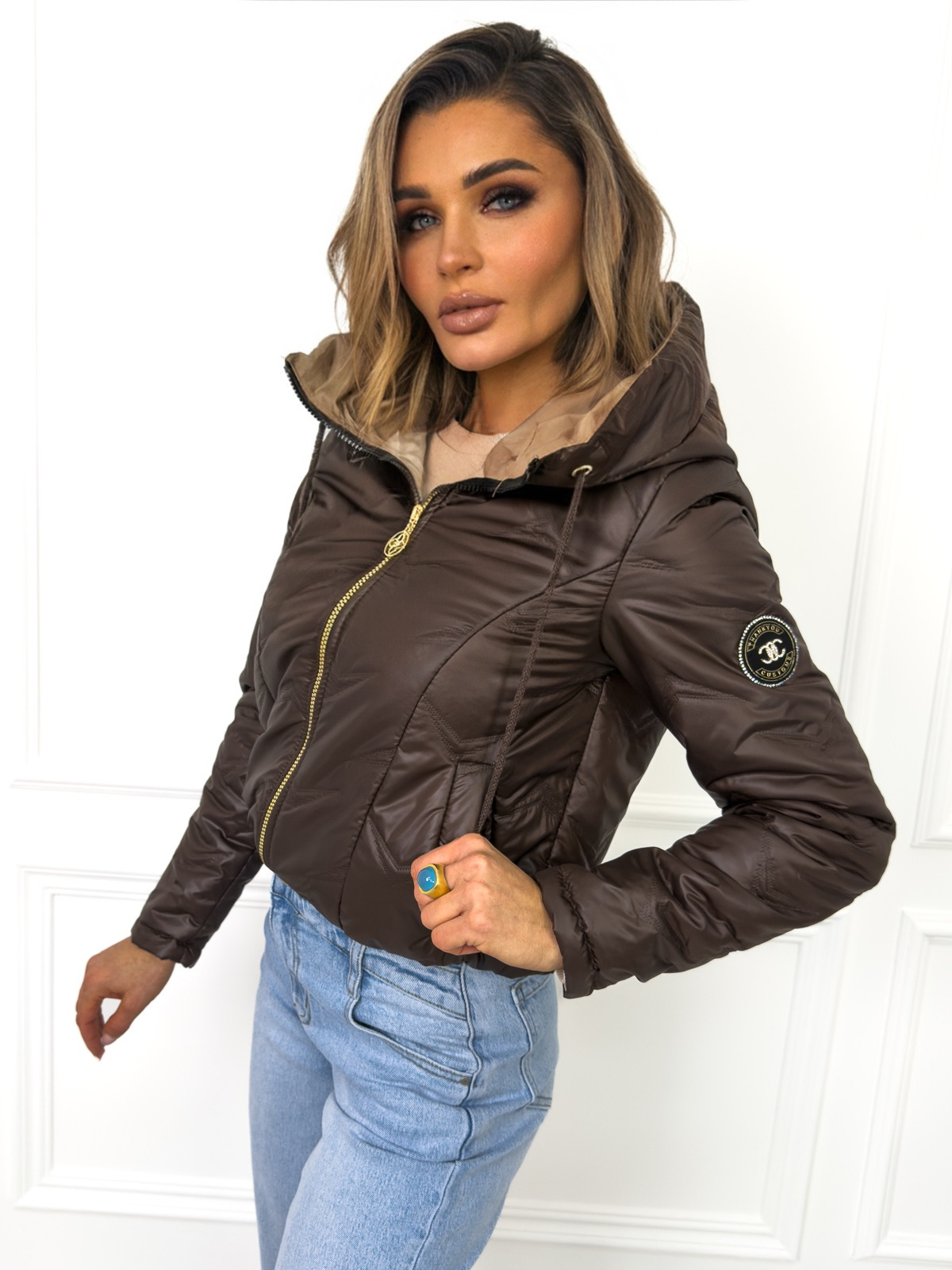 Kurtka przejściowa z kapturem, pikowana ze ściągaczem na dole.