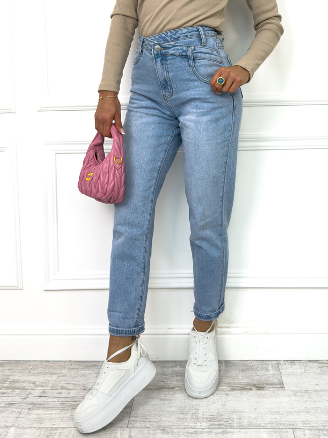 Spodnie jeansowe z szerokimi nogawkami. Asymetryczne zapięcie, elastyczny materiał.