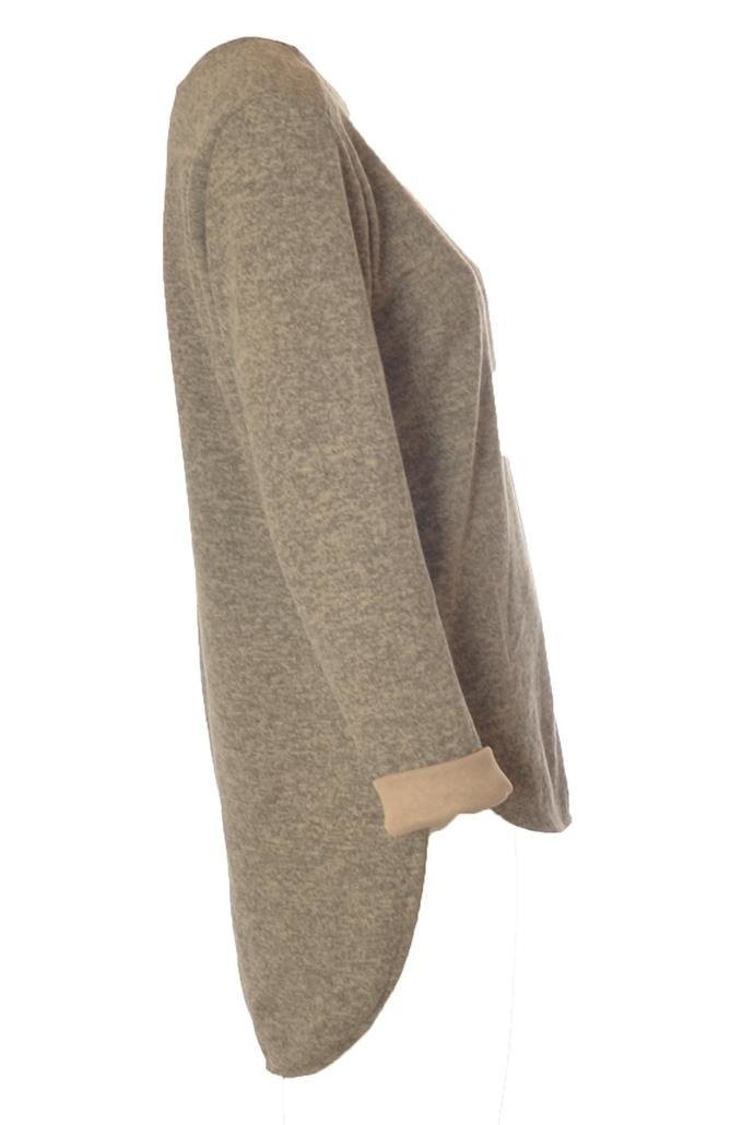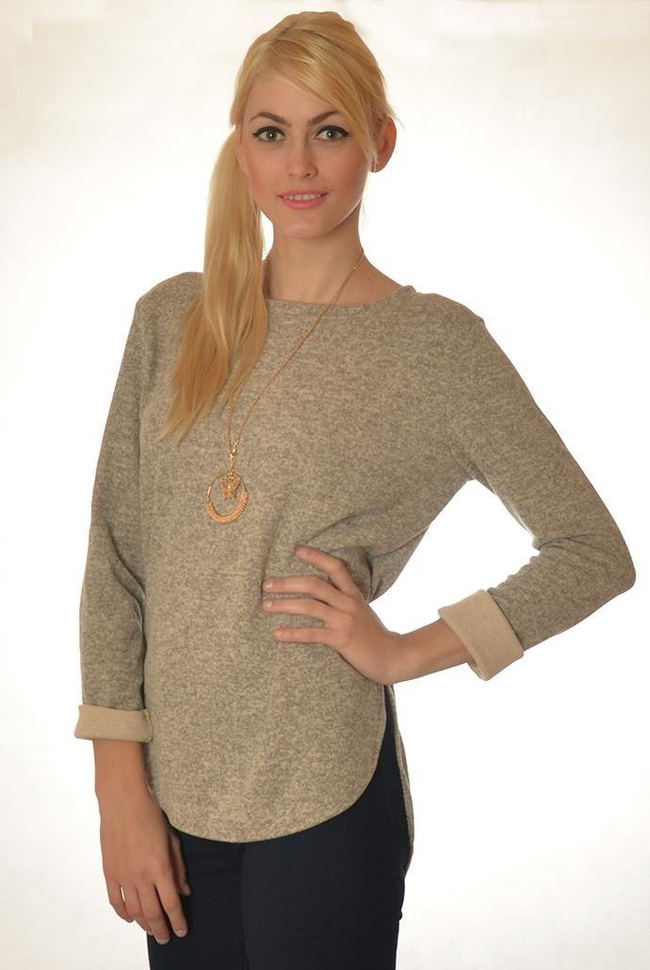 Beżowa, asymetryczna bluzka z wisiorkiem z motylkiem.